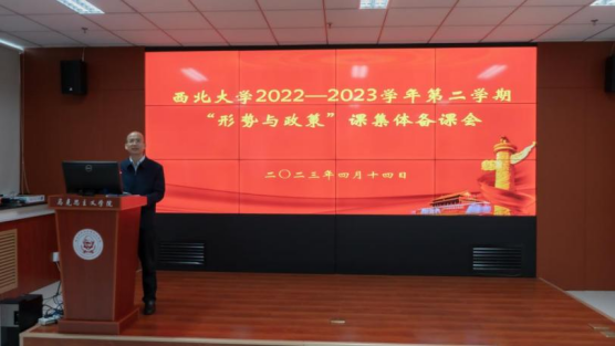 “形势与政策”课教研部副主任赵沛结合自己的课程教学实践,介绍了本学期“形势与政策”课教学要点的主题、主旨及八个方面的主要内容。首届全国高校思政课教学展示二等奖获得者、陕西省思政课大练兵“教学标兵”张少博副教授作了示范授课。