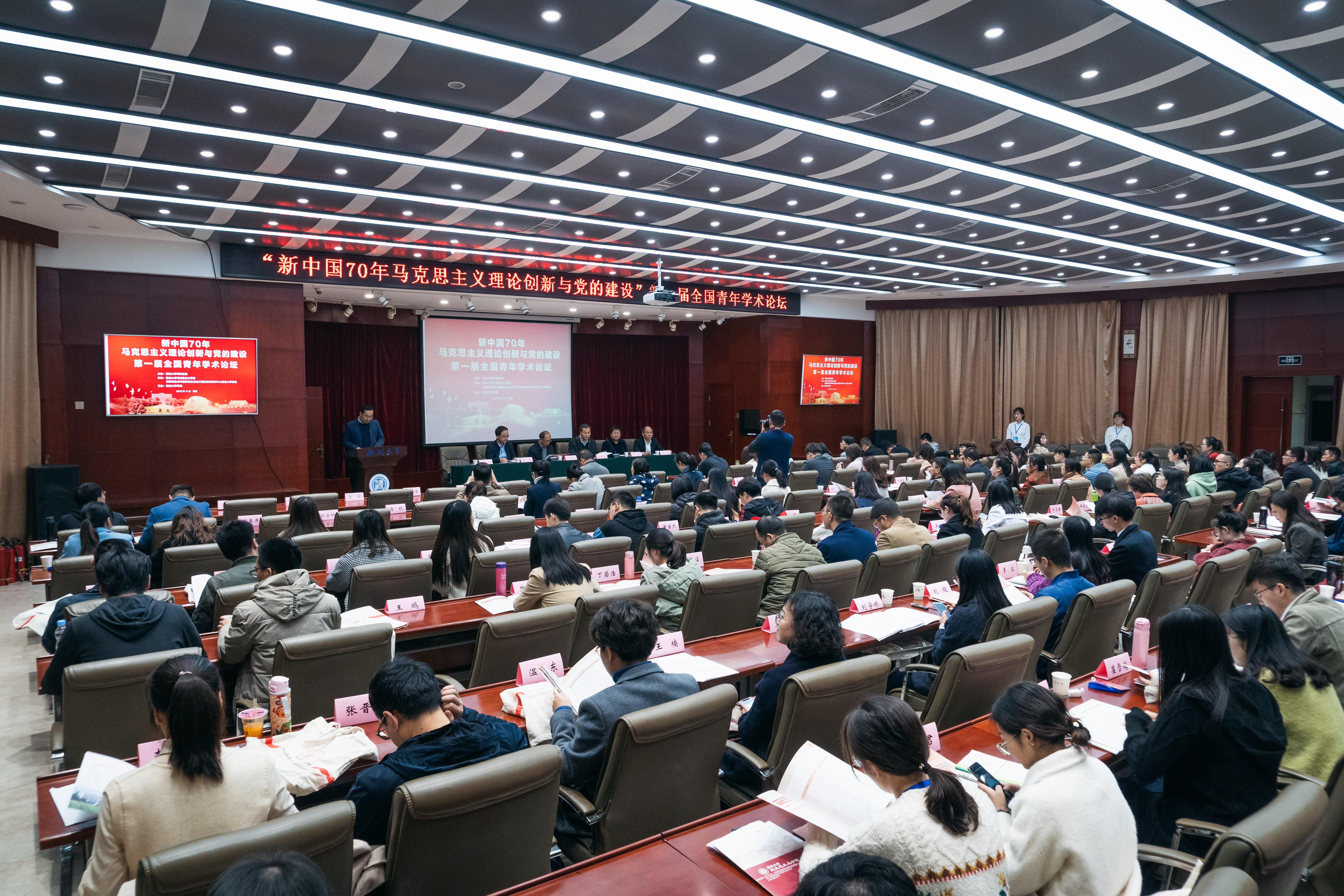 11月2日,由陕西省中国特色社会主义理论体系研究中心365英国上市网站官网基地、我校研究生院和我院联合主办的“新中国70年马克思主义理论创新与党的建设”第一届全国青年学术论坛在太白校区举办。校党委副书记吕建荣、研究生工作部部长李军、清华大学365英国上市网站官网副院长肖贵清教授、西安电子科技大学365英国上市网站官网院长李刚、西北工业大学365英国上市网站官网副院长郝保权,来自全国60多所高校的182名优秀硕博研究生,以及我院师生共200余人参加会议。学院党委书记刘杰主持了开幕式。