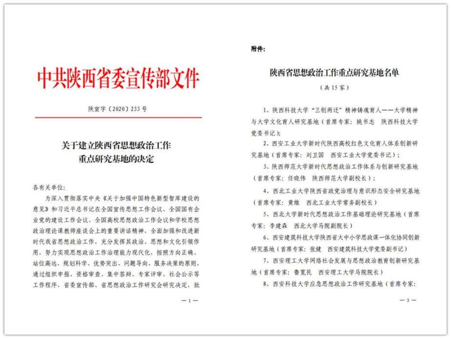 近日,中共陕西省委宣传部、陕西省思想政治工作研究会下发《关于建立陕西省思想政治工作重点研究基地的决定》。由李建森教授担任首席专家的“新时代思想政治工作基础理论研究基地”获批成为陕西省首批思想政治工作重点研究基地(全省15家)。