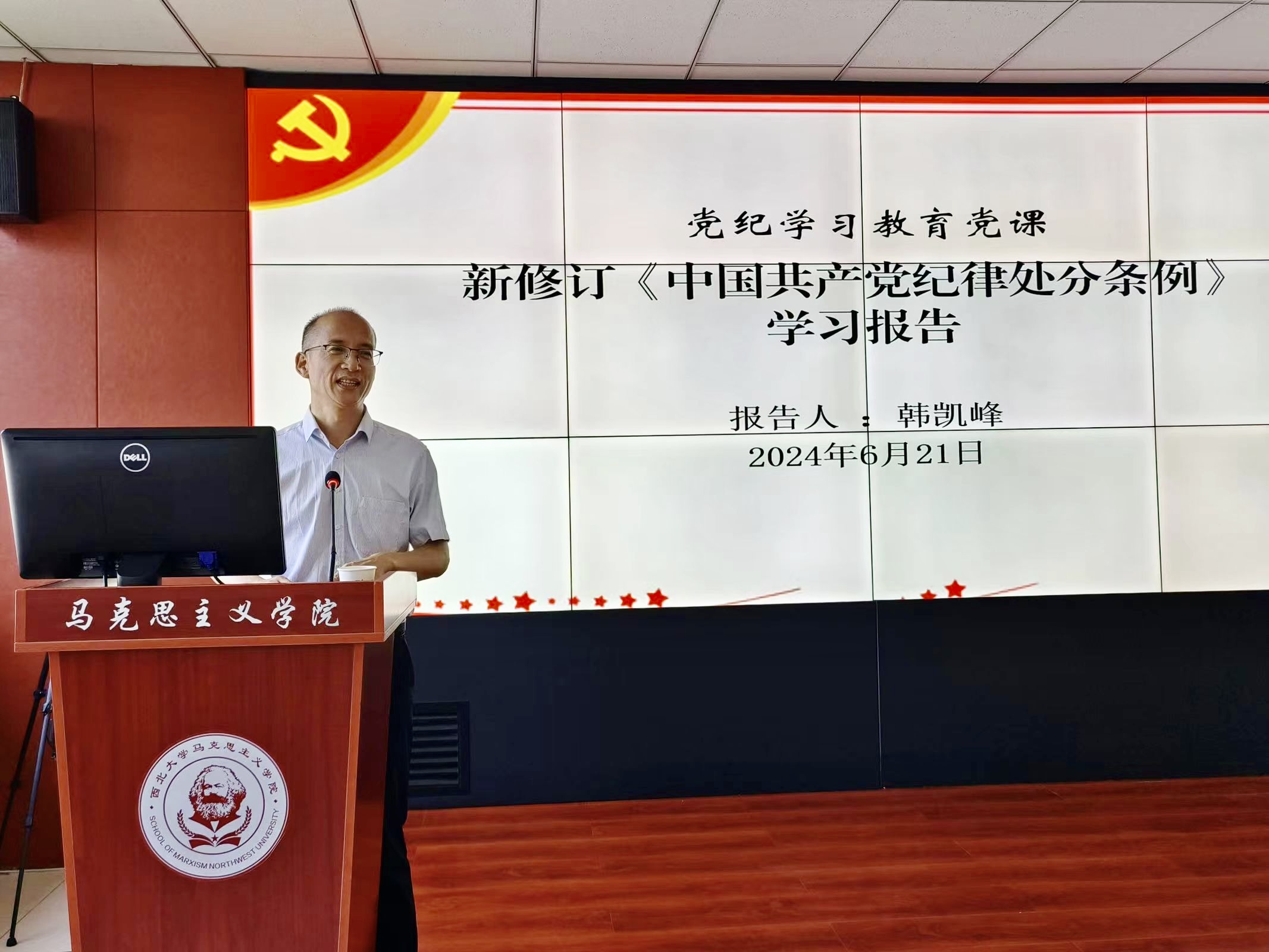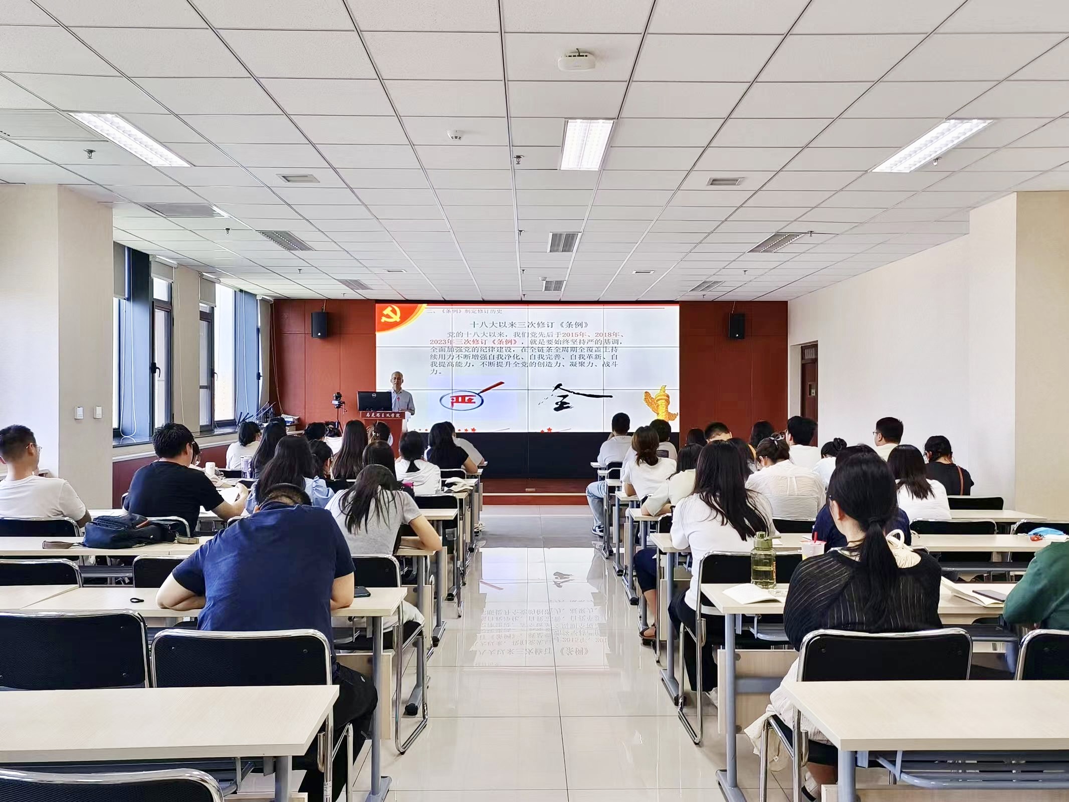 6月21日下午,365英国官网党委书记韩凯峰在学院报告厅,以《新修订<中国共产党纪律处分条例>学习报告》为题,为学生第一党支部全体党员讲授党纪学习教育党课。