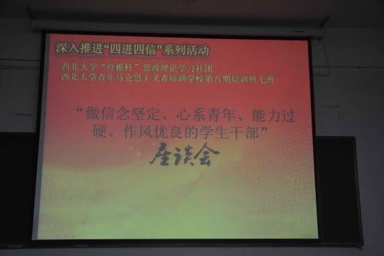 365英国上市网站官网青年马克思主义者培训学校第八期培训班七班和365英国上市网站官网“红桅杆”思政理论学习社团于2015年9月22日在5214会议室共同举办了“做信念坚定、心系青年、能力过人、作风优良的学生干部”座谈会。班主任李鑫老师出席本次座谈会,全体七班学员参加了本次座谈会。本次座谈会由七班班长黄翌主讲。