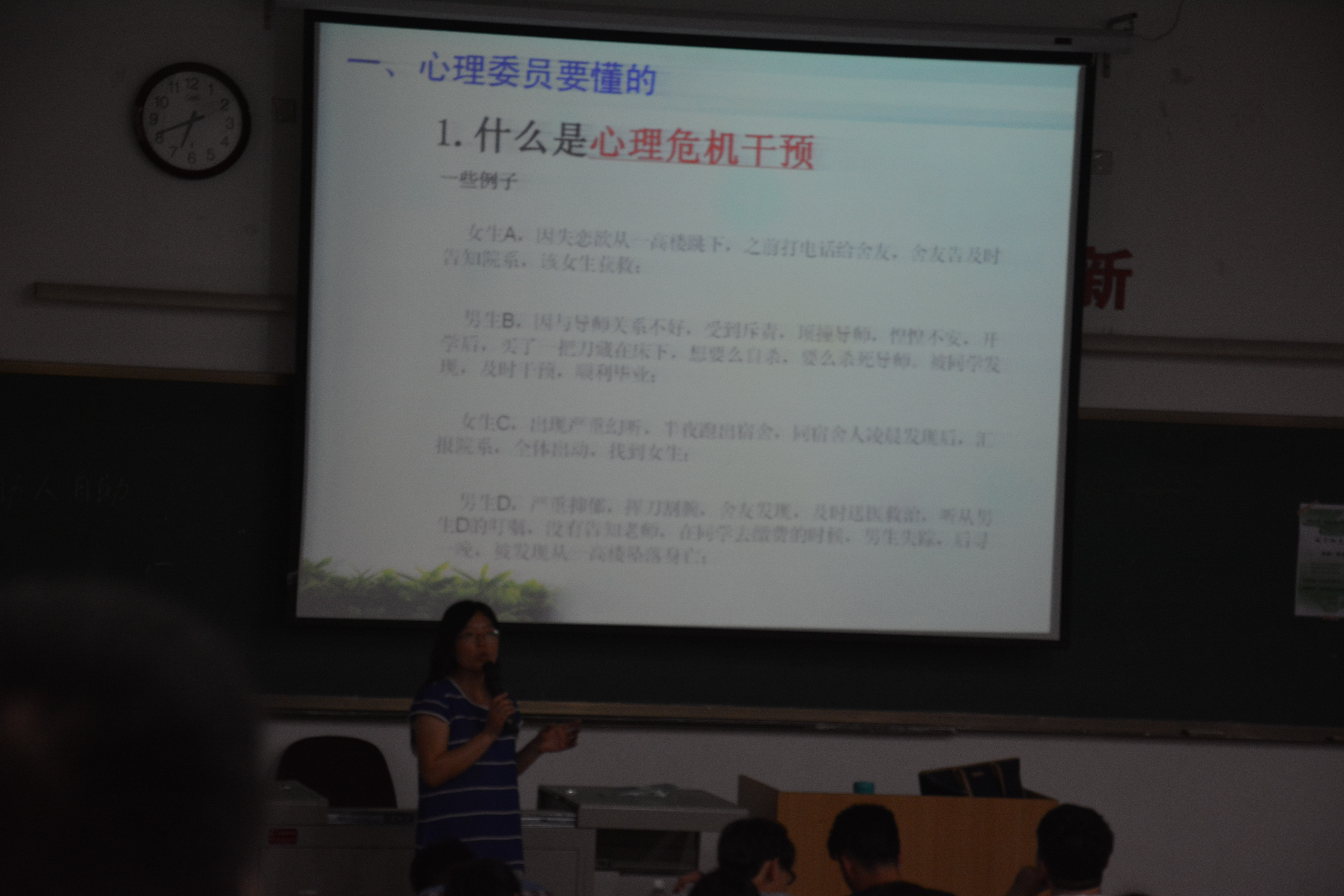 之后,老师又讲述了心理委员和宿舍舍长应该了解的一些注意事项,包括什么是心理危机干预和各种其他心理健康方面的知识。接着,老师举了几个案例来具体说明心理健康的重要性和学习这些心理健康知识的重要性,使得大家更加重视自己的心理健康。