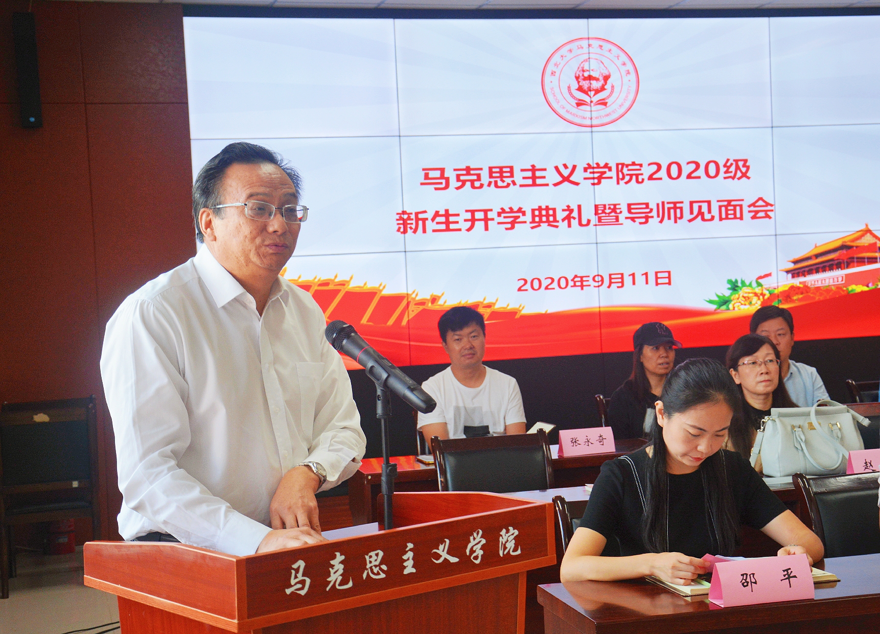 王永智教授作为导师代表发言。他表示,“有缘相聚,教学相长”,来到西大、来到马院,同学们应该发扬西大“公、诚、勤、朴”的校训,找准定位,在学术研究上发力。他寄语新生:一要做有研究能力的人,强调做学问要励志、要有方向、要有境界;二要做适应社会发展,有所作为的人,培养自身的洞察力和实践力;三要做自安自足,有益于他人的人。