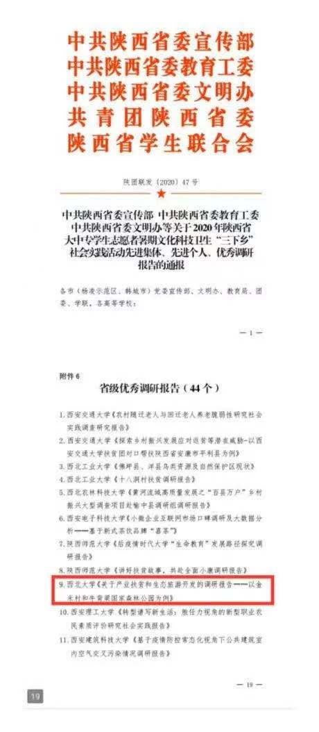 11月20日,根据《中共陕西省委宣传部 中共陕西省委教育工委 中共陕西省委文明办等关于2020年陕西省大中专学生志愿者暑期文化科技卫生“三下乡”社会实践活动先进集体、先进个人、优秀调研报告的通报》文件有关通知,365英国官网“保护绿水青山,助力脱贫攻坚”实践队所撰写的调研报告获得“省级优秀调研报告”。
