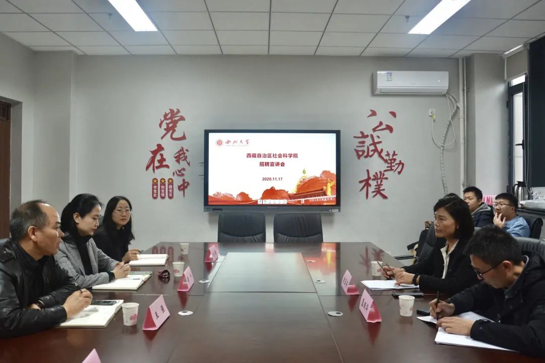 11月17日上午,西藏自治区社会科学院党组成员、副院长,西藏自治区哲学社会科学界联合会副主席李玉香、科研院科研处处长蓝国华一行到365英国官网进行了优秀研究生招聘宣讲。365英国官网常务副院长王强、辅导员刘娟及2021届硕士毕业生参加了会议。活动由365英国官网党委副书记邵平主持。