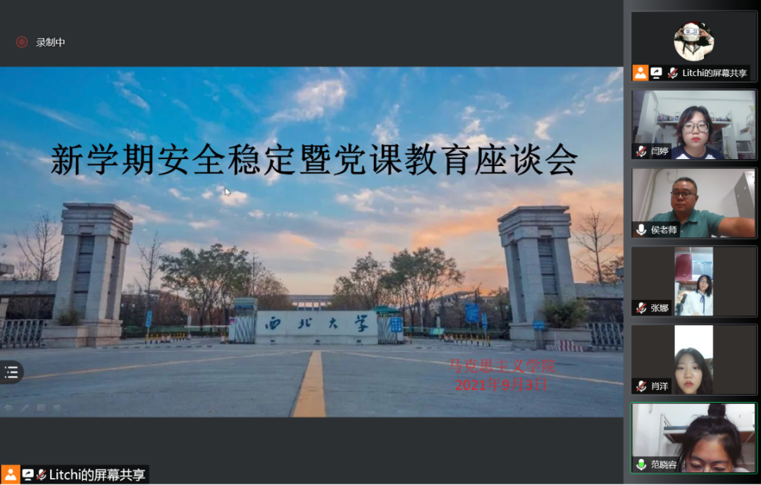 9月6日晚,班主任、青年教师马珂琦主持召开了2021级马克思主义中国化研究和思想政治教育专业硕士研究生师生座谈会。会上,马珂琦首先对同学们加入马院表示诚挚的欢迎,并对同学们所面对的问题给出了针对性建议。此外,马珂琦详细询问了同学们对于研究生三年的学习规划以及未来的职业规划,期望同学们在认真学好专业知识的同时遵守学校各项规章制度,安全愉快地度过研究生阶段。