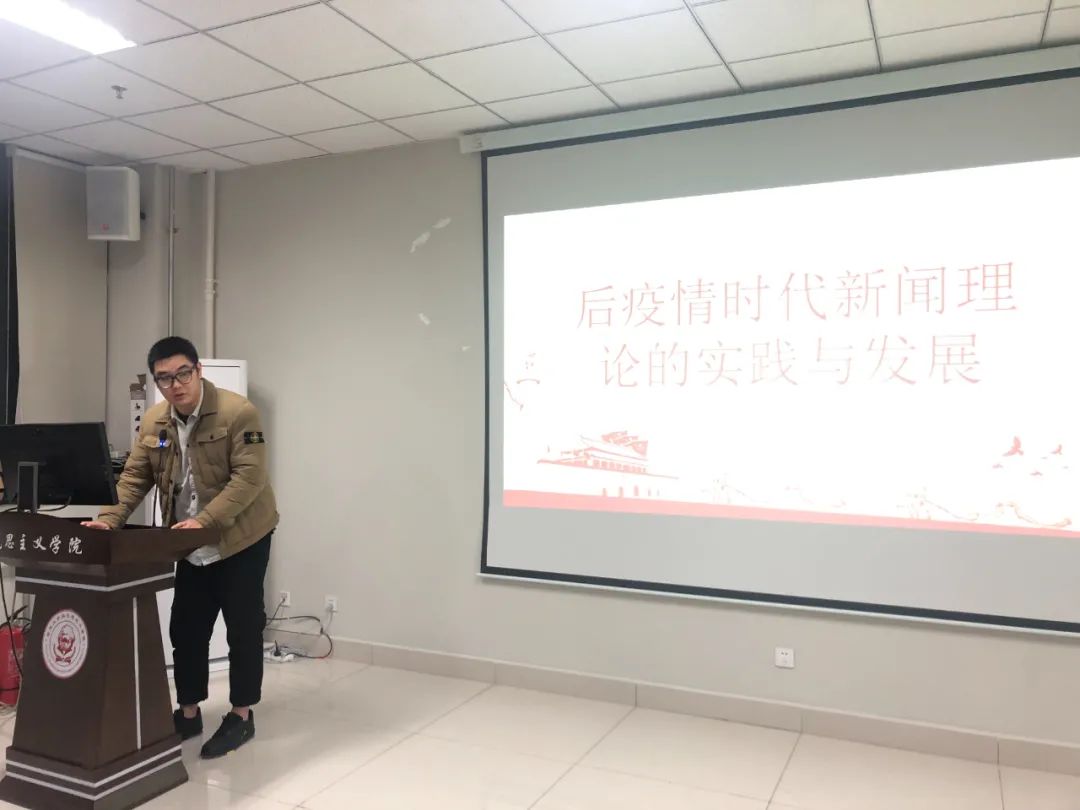 惠明国同学以《后疫情时代新闻理论的实践与发展》为主题,以后疫情时代社会变迁的影响为切入点,分析了后疫情时代新闻理论的发展,指出新闻媒体在疫情背景下更要加坚定马克思主义在新闻舆论工作中的指导地位,坚持正确的舆论导向,引导同学们树立正确的世界观、人生观、价值观。