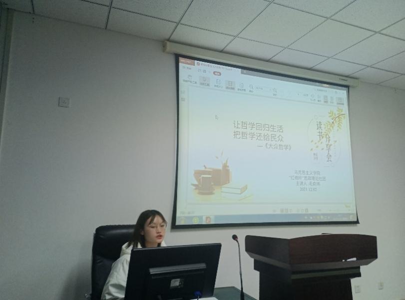 毛俞玮主讲的内容是《让哲学回归生活,把哲学还给大众》,她讲述了《大众哲学》的作者艾思奇在从事马克思主义哲学研究、宣传和教育工作时,注重将马克思主义哲学通俗化和大众化,同时引导同学们就“唯心主义、二元论和机械唯物主义的批判”加以分析,并以生动有趣的“七十二变”、“无风不起浪”等小故事向同学们映射了生活里的哲学智慧,启发同学们在学习和生活中要有实事求是的态度,将哲学智慧融入学习和生活中。