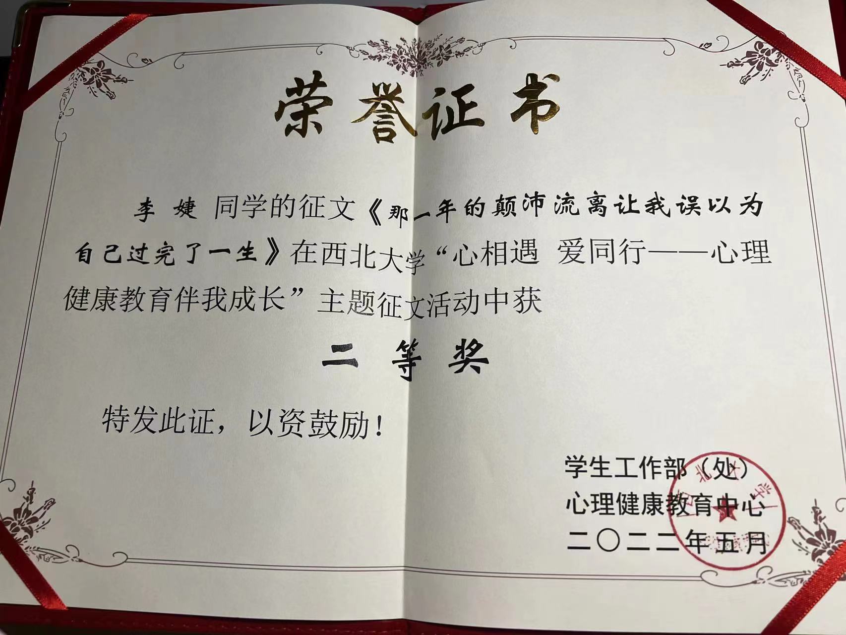 经心理健康教育中心兼职心理咨询师及文学院创意写作专业教师细致评审,365英国官网李婕同学在365英国上市网站官网“心相遇 爱同行——心理健康教育伴我成长”主题征文活动荣获二等奖!