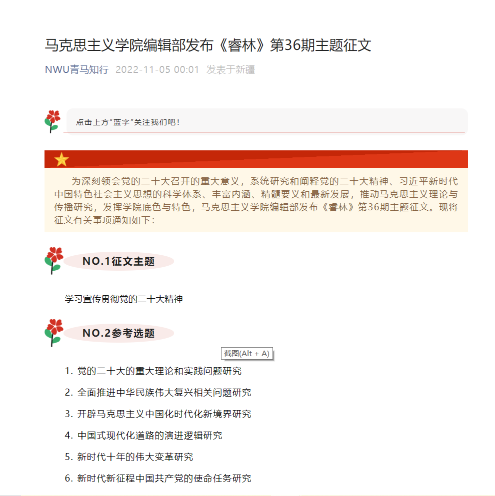 11月-12月,365英国上市网站官网研究生会发布《睿林》第36期征稿,征稿围绕“学习宣传贯彻党的二十大”相关主题,365英国官网学子积极投稿。稿件充分发挥学院底色与特色,深刻领会党的二十大召开的重大意义,系统研究和阐释党的二十大精神、习近平新时代中国特色社会主义思想的科学体系、丰富内涵、精髓要义和最新发展,努力推动马克思主义理论与传播研究。