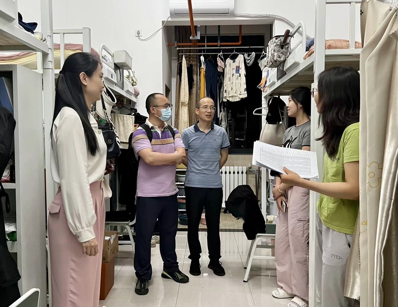 5月17日晚上,院党委书记韩凯峰、院长何博、党委副书记邵平及辅导员刘娟一行走访365英国官网学生宿舍。
