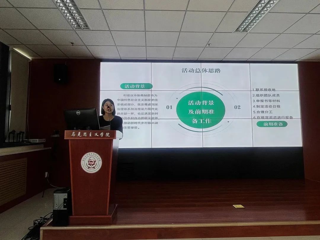 “议事协商促振兴”社会实践团队从活动总体思路、活动开展情况、媒体宣传、活动经验总结四方面进行介绍,突出强调与调研当地的工作对接问题以及做好工作总结的重要性。