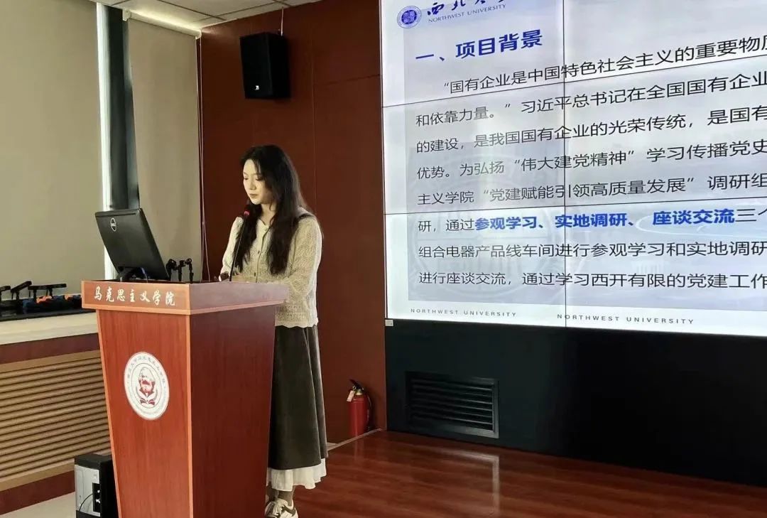 “党建赋能引领高质量发展”社会实践团队从项目背景及团队概况、完成实况、成果汇报三方面进行展示。该团队通过实地参观、座谈交流的形式了解了国有企业的党建工作,在实践中提高了学思践悟、融会贯通的能力。