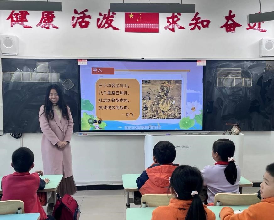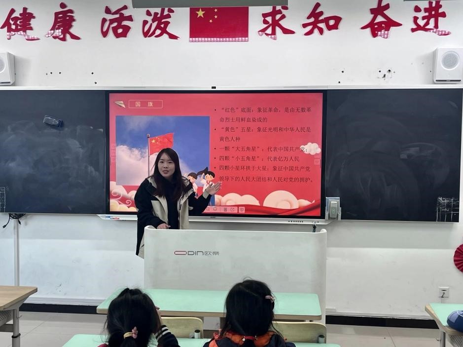 崔艳文以《我爱你中国》为题,从国庆小长假的例子引入,为同学们介绍了国庆节的由来,国旗的含义、国徽的构成以及国歌背后的故事,让学生全面地了解我们的祖国,培养他们爱国、敬国、念国的情怀。
