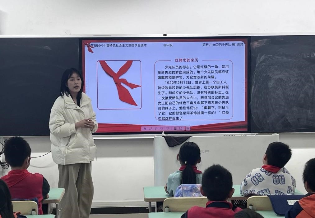 郭颖慧以《光荣的少先队》为题,她在与小朋友们的热情互动中,讨论并学习了中国少年先锋队的性质、成立少先队的意义以及成为合格少先队员的条件等内容,从而使小朋友们对少先队员这一角色有了更加深入的认识。