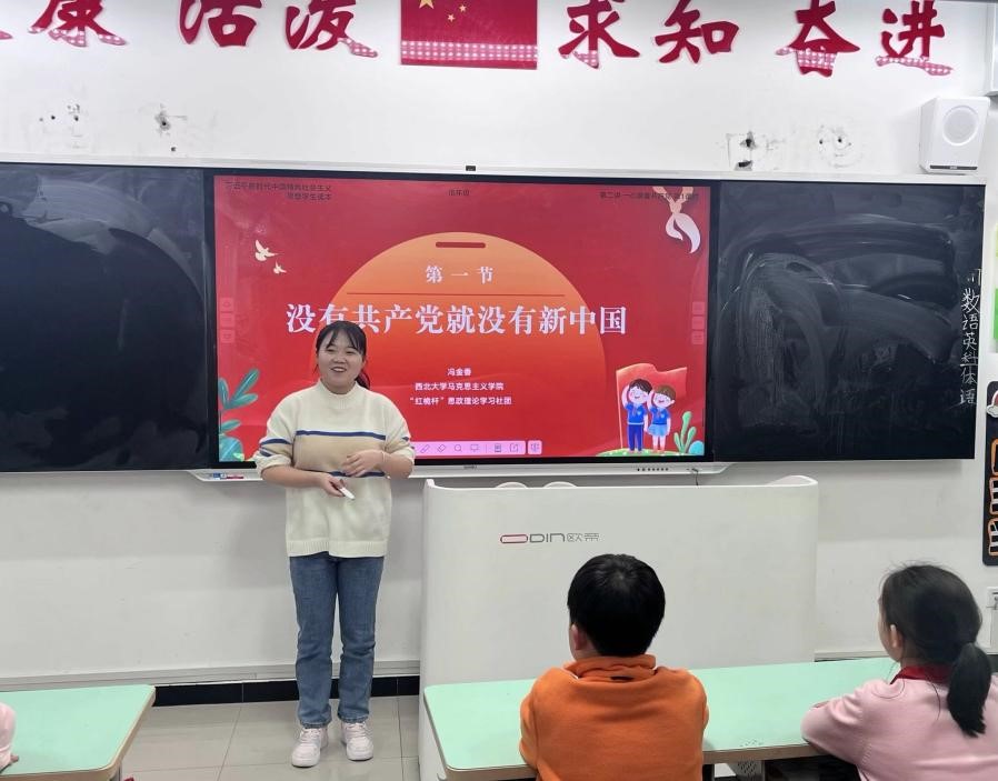 冯金香以《没有共产党就没有新中国》为题,通过歌曲导入,讲述中国共产党为中国人民谋幸福、为中华民族谋复兴的百年奋斗历程,激发同学们的爱国之情和民族自信心。
