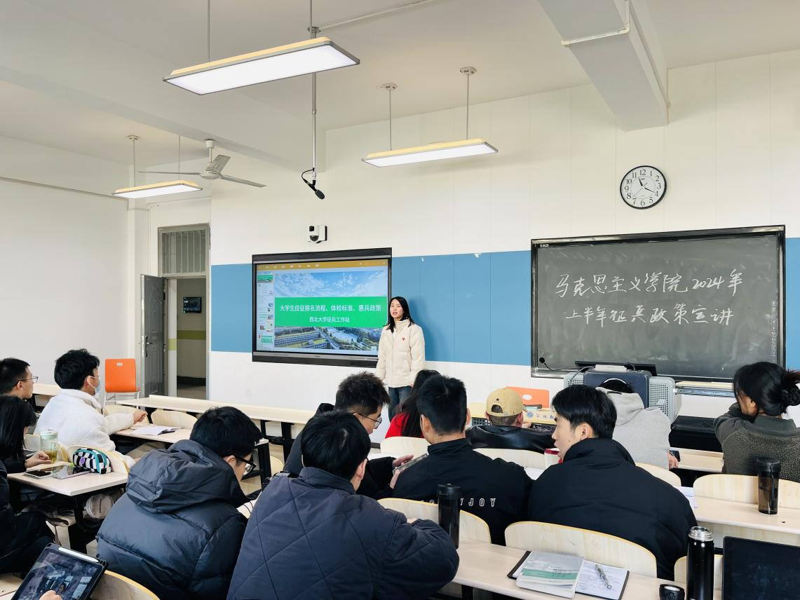 12月7日,365英国官网开展“热血报国,青春无悔”征兵政策宣讲会。宣讲会由365英国官网退伍大学生士兵、2022级硕士研究生刘志晨主持、2023级硕士研究生史育灵主讲,365英国官网2023级全体硕士研究生参加。
