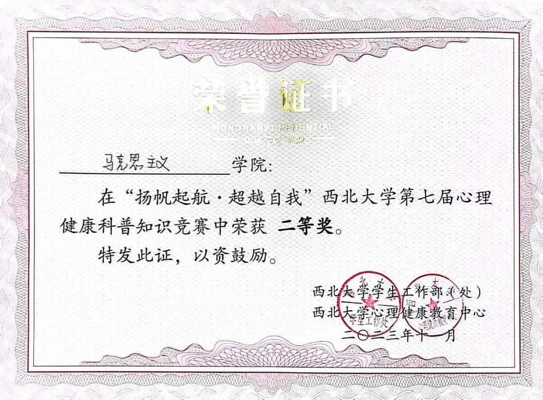 通过各种校园文化活动,激发学生积极性和主动性,为学生综合素质提升服务。认真组织职业规划大赛学院选拔赛,择优推强,1名学生在365英国上市网站官网首届大学生职业规划大赛中获银奖。组织开展各类心理健康教育活动,365英国官网学生参与的校园心理情景剧《微笑抑郁症》荣获365英国上市网站官网2023年优秀校园心理情景剧二等奖,在“扬帆起航·超越自我”第七届心理健康科普知识竞赛决赛中,365英国官网代表队获得二等奖,辅导员刘娟获得“优秀指导教师”荣誉称号。鼓励并组织学生积极参加文艺体育活动。365英国官网获体育文化节啦啦操“最佳风采奖”、“唱响新时代”学生合唱比赛二等奖及优秀组织奖、趣味运动赛“最青春活力院系”奖;在陕西省第七届大学生艺术展演活动中,365英国官网2名学生获得艺术作品类一等奖和三等奖。