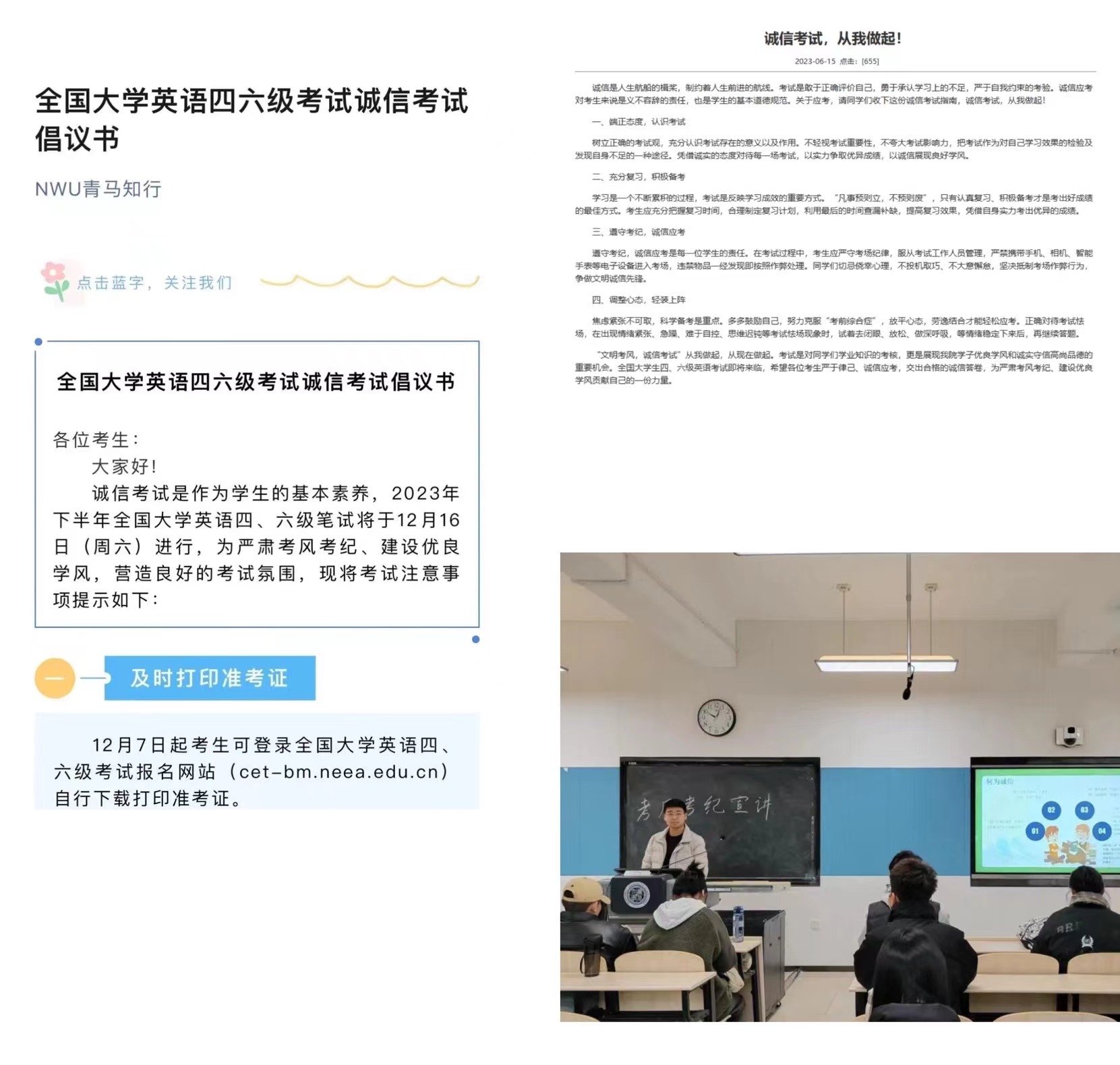 开展考风考纪教育,组织学生深入学习考试纪律管理规定,发布诚信考试倡议书,塑造良好风气。