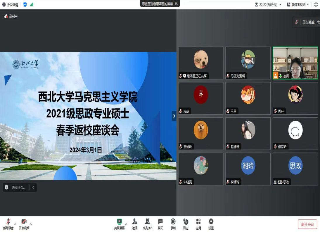常璇老师首先通过同学们的自我介绍,了解了大家的基本情况,并对同学们提出的问题进行了答疑解惑。她叮嘱同学们要将保持身心健康放在第一位,学会疏解情绪、排遣压力,希望同学们能够以良好的心态应对这个阶段所面临的挑战,明确规划,积极地做好毕业论文开题的准备工作,尽早明确就业方向,注重自身各方面能力的提升。