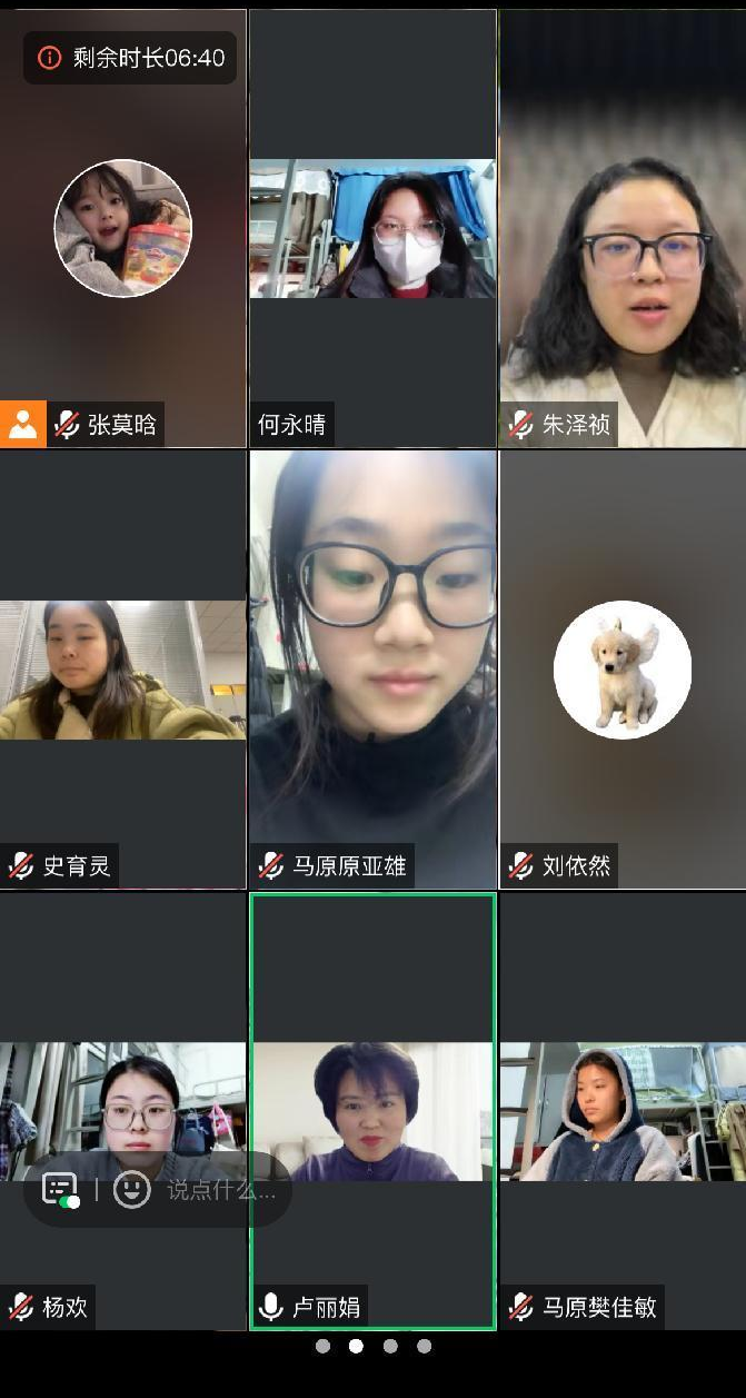 卢丽娟老师在座谈会上耐心询问了每一位学生的寒假安排。首先,她了解了每一位学生在寒假期间的规划,对同学们提出的问题做出一一的解答,引导学生在寒暑假期间做好自己的学业规划。其次,她对每位同学在寒假期间的社会实践情况进行了了解,并鼓励同学们多多参加各种实践活动,丰富日常生活,为就业奠定基础。最后,她叮嘱同学们要明确自身定位,树立正确的理想信念,明确职业目标。