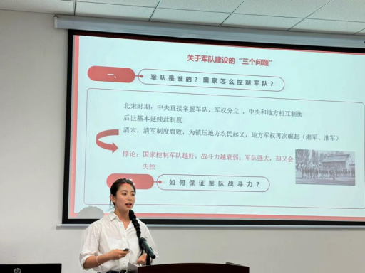 李奕瑾以《人民军队的“铸魂”之路》为题,通过梳理我国政军关系发展史,并围绕“党指挥枪”这一原则,着重讲述了三湾改编和古田会议的重要内容及意义,由此来介绍我国的军事制度和军事思想,从而阐明了“听党指挥,能打胜仗,作风优良”这一指示的伟大意义。