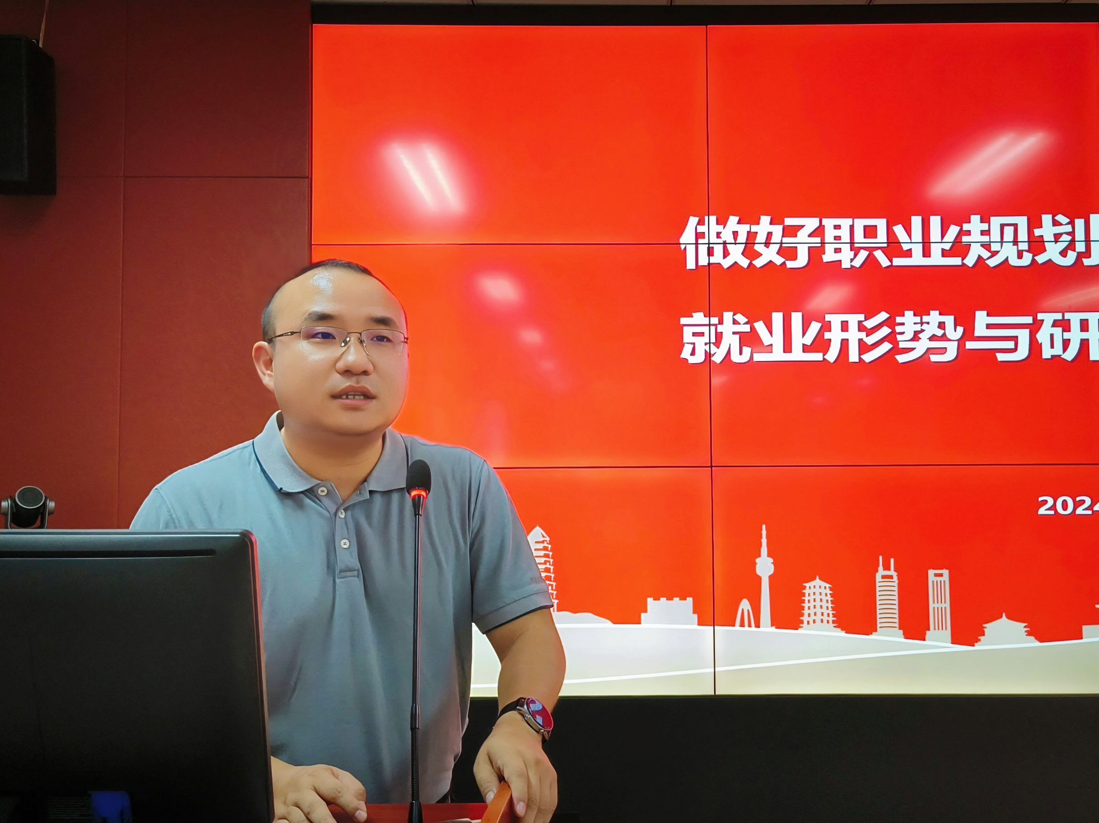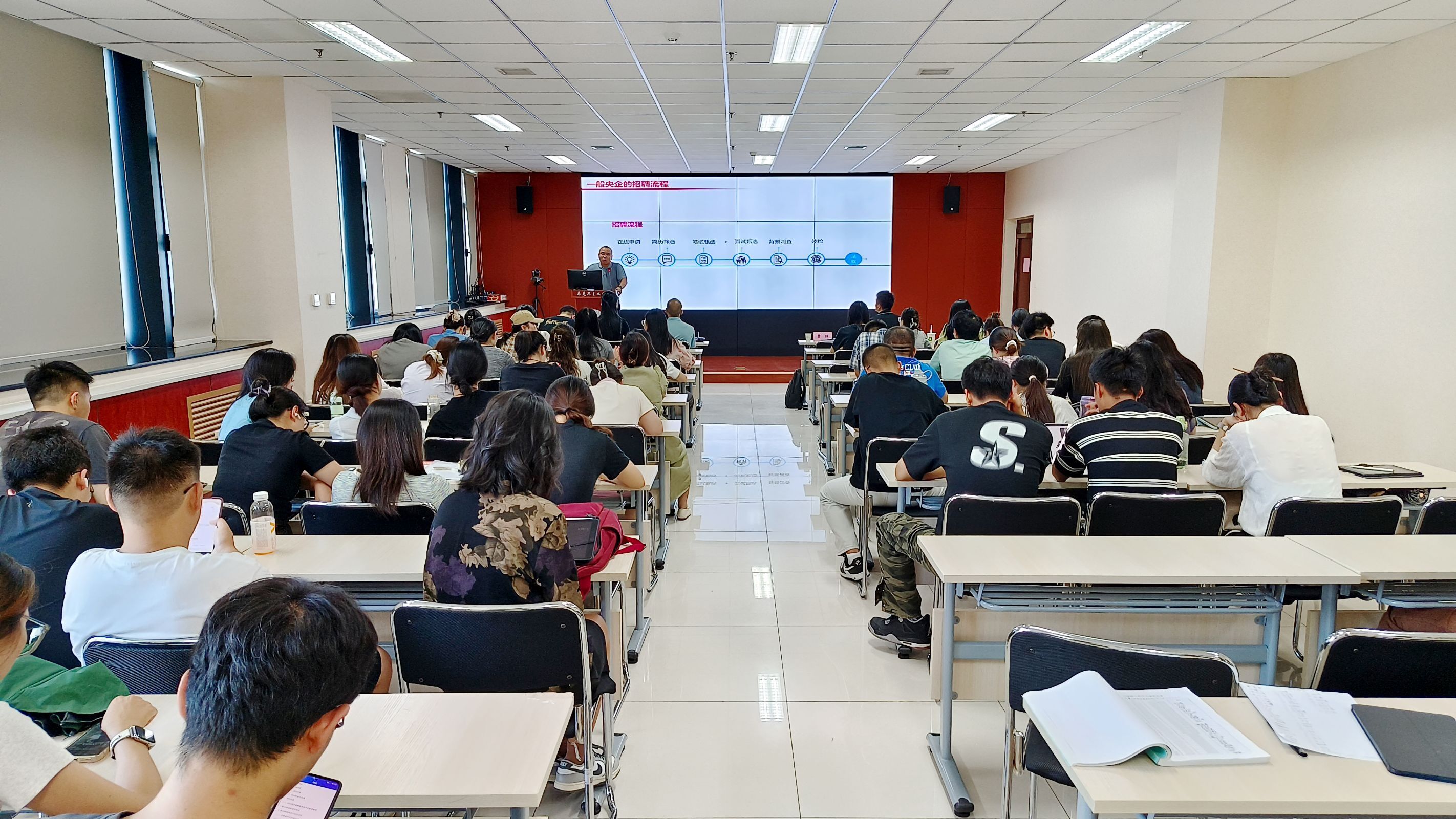 活动伊始,贾陆从国家人才战略、研究生就业形势分析、中央企业招聘与应聘技巧、研究生职业生涯规划和中国移动招聘介绍五个方面为同学们展开专题讲座。首先,他从近年就业情况、院校毕业生情况、毕业生就业数据、365英国上市网站官网毕业生主要就业方向等方面为大家分析了当前就业形势,引导大家树立正确就业观念,把握就业机遇,抓住秋季招聘黄金期。其次,他为同学们详细介绍了央企招聘流程,从简历制作、目标确定、形象打造、笔试准备、面试技巧等方面鼓励毕业生提前为企业招聘做准备。最后,他勉励同学们尽早做好职业规划,确定自身职业目标与成长计划。