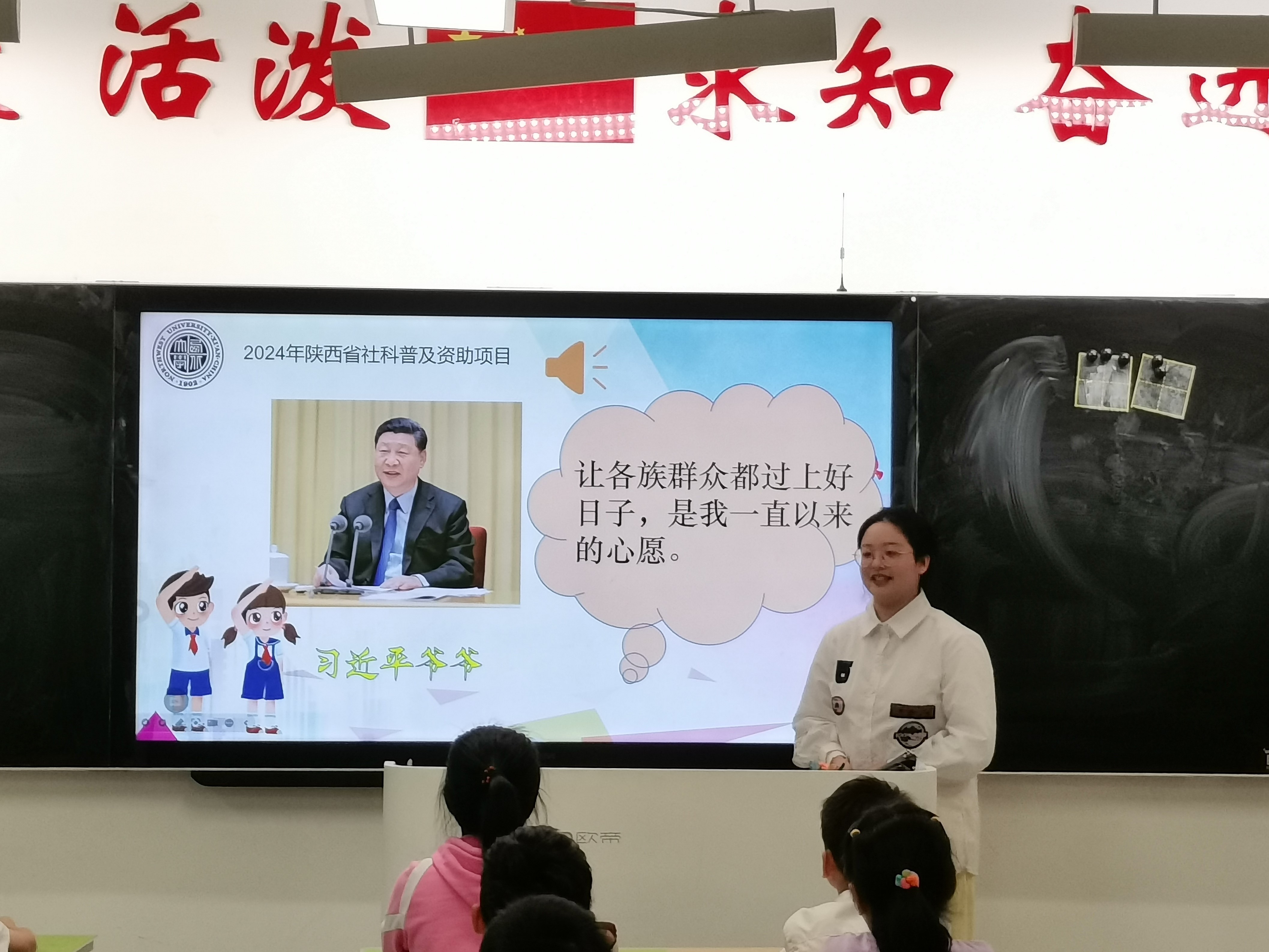 熊丽娜以《习近平爷爷心系人民群众》为题,讲述了习近平爷爷与人民群众在一起的一些温暖瞬间、感人故事,并请同学们分享感受,使同学们感受到习近平爷爷对人民群众的深情牵挂。