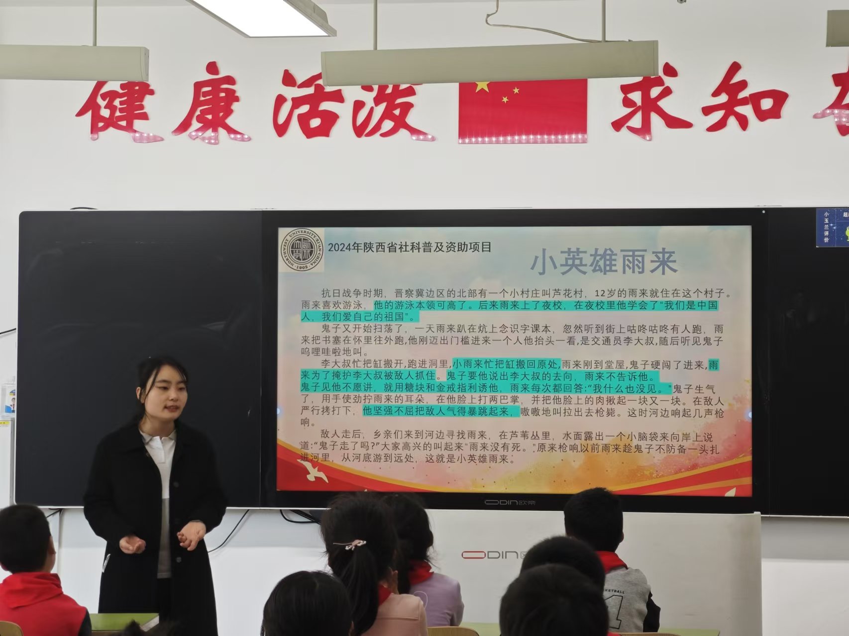 燕卉雅以《光荣的少先队》为题,带领同学们回忆了加入少先队时的情景,接着讲述了少先队队旗和红领巾的含义,启发同学们要听党话、跟党走,让胸前的红领巾更加鲜艳。