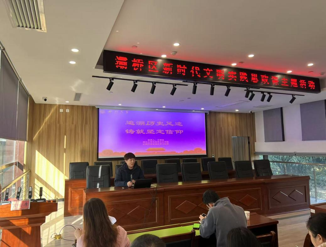 王智远以《追溯历史足迹,铸就坚定信仰》为题,详细讲述了中国共产党第一次全国代表大会的召开过程以及本次大会取得的重大成果,并通过一系列红色故事讲解了伟大建党精神的科学内涵,勉励大家要铭记历史,传承伟大精神谱系,积极投入到国家的发展大局中去,以实际行动书写新时代的辉煌篇章。