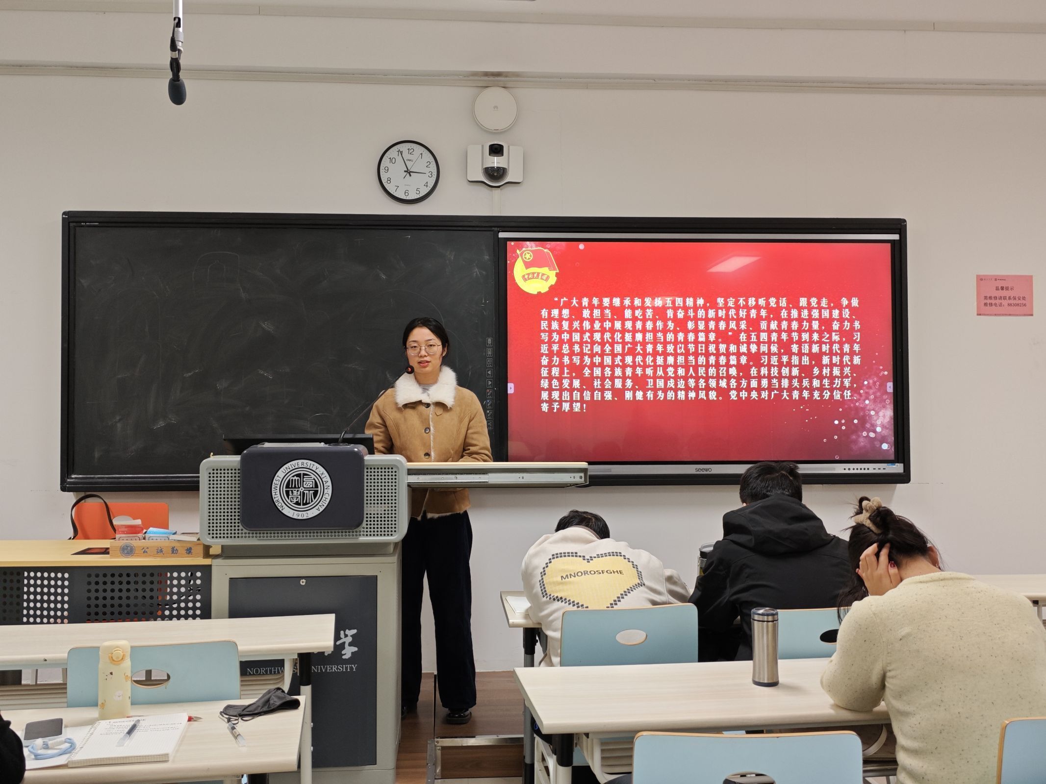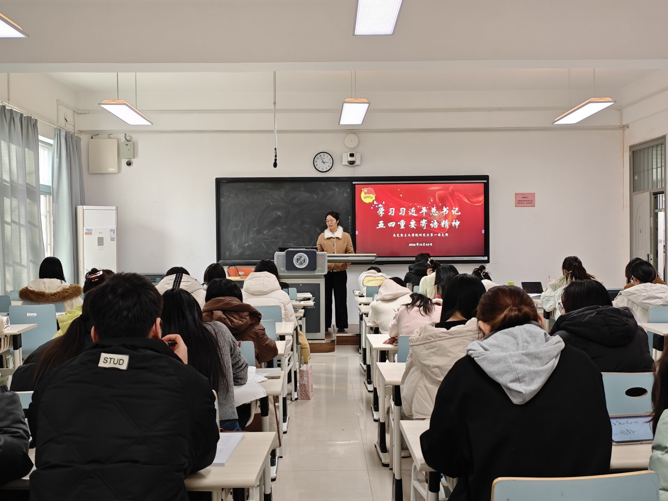 活动伊始,马俊和同学们一起学习了习近平总书记五四重要寄语精神的相关内容并观看了相关视频。随后,她呼吁同学们要响应号召,继承和发扬五四精神,坚定不移听党话、跟党走,争做有理想、敢担当、能吃苦、肯奋斗的新时代好青年。同学们也进一步领悟到,在推进强国建设、民族复兴伟业中要展现青春作为、彰显青春风采、贡献青春力量,奋力书写为中国式现代化挺膺担当的青春篇章。