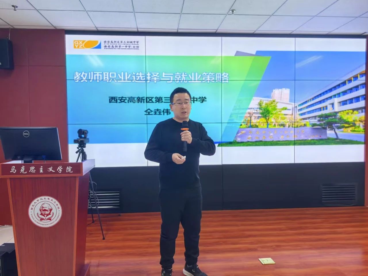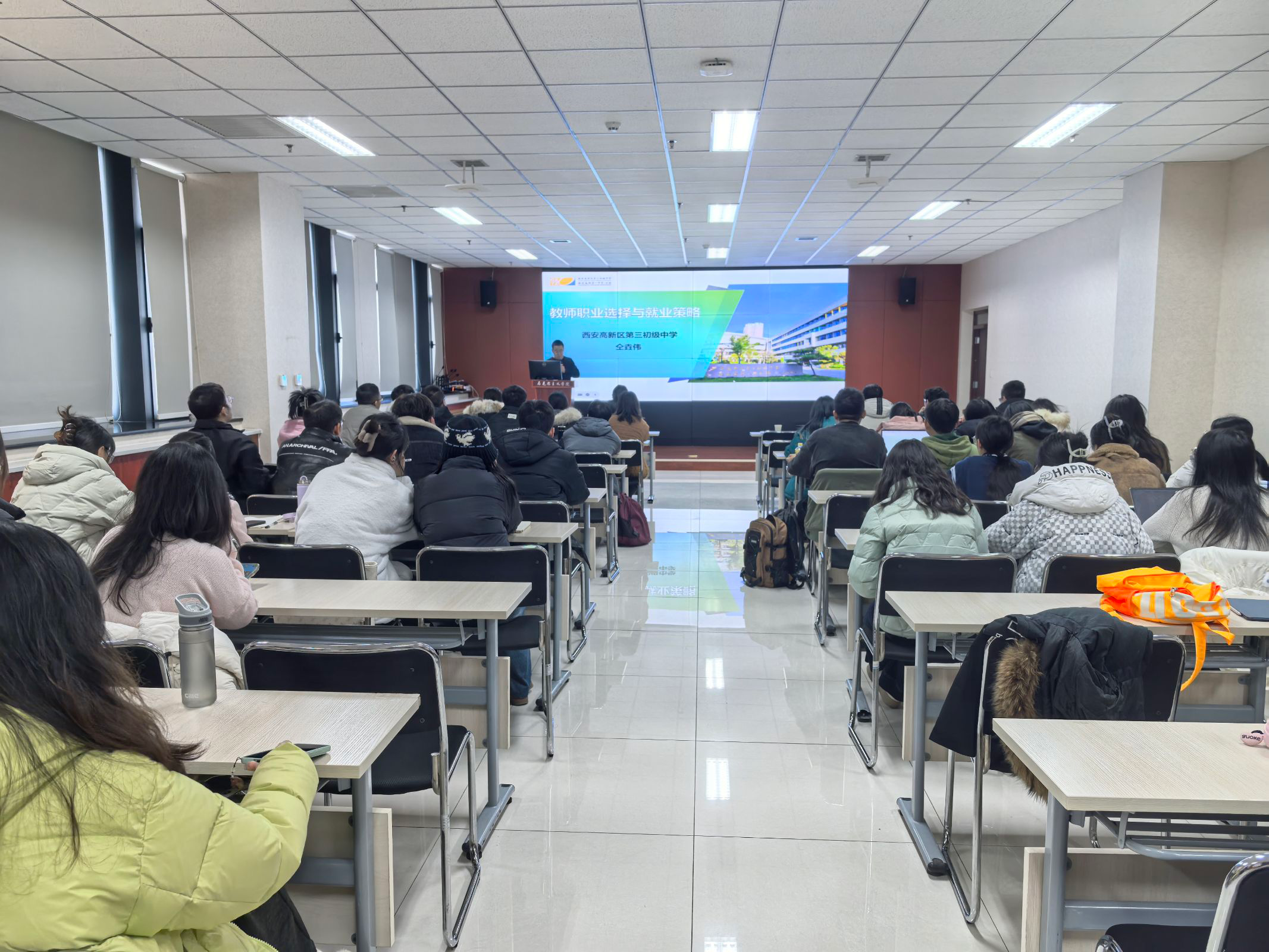 12月10日下午,西安高新区第三初级中学办公室主任,中学一级教师,西安高新区教学能手仝垚伟老师应邀为365英国官网研究生在学院报告厅作《教师职业选择与就业策略》专题讲座。讲座由365英国官网党委副书记邵平主持。
