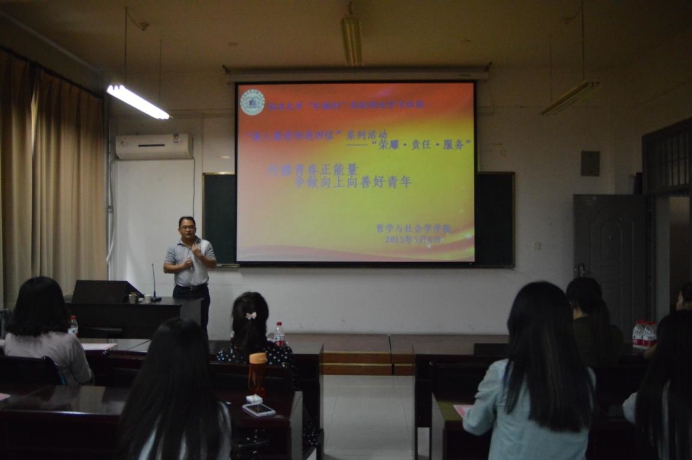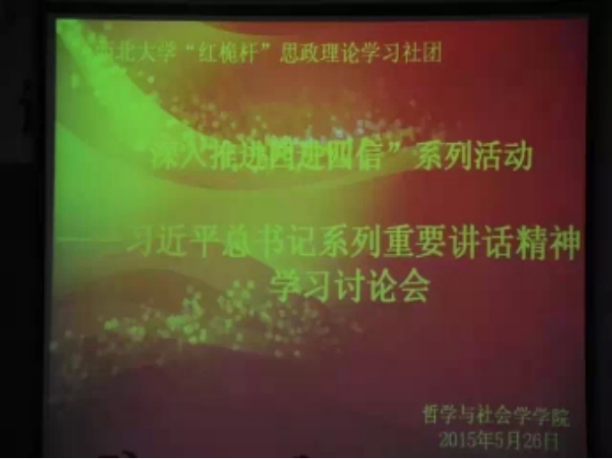 4.团课工作:团课工作是本社团贯彻落实“四进四信”工作的一大亮点。社团结合当前实际,并结合大学生团学工作的实际特点,开展了一系列“进团课”活动。例如,本社团举办“传统文化与社会主义核心价值观”大讲堂活动,邀请专家学者对此进行深入剖析,传播理论。本社团举办数期“‘深入推进四进四信’系列活动——习近平总书记系列重要讲话精神学习交流会”,围绕“习近平总书记的黄土情结”、“党史国史是必修课”、“三严三实的践行与落实对大学生的意义”、“反对历史虚无主义”等题开展“进团课”活动,取得了非常好的效果,得到大家一致好评。