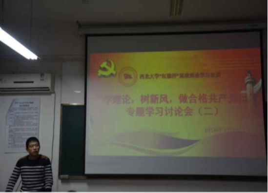 为了切实做好社团各项工作,进一步发扬社团的优秀精神,2016年3月23日下午两点半,“红桅杆”思政理论学习社团于5214会议室召开了第二期“学理论,树新风,做合格党员”专题学习讨论会。辅导员李鑫老师出席会议并发表讲话,社团全体成员参加了会议。本次会议由社长黄翌主持。