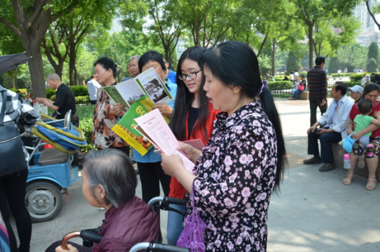 志愿者主要通过向现场的社区居民发放关于宁养服务知识的传单,让大家对宁养服务的基本内容和社会工作专业有一个基本的认识和了解。