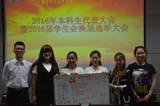 经过同学们的投票,最终决定了2016届学生会由主席李钰莹,副主席王捷、王晨阳、王昕圆、杨艺凝组成。