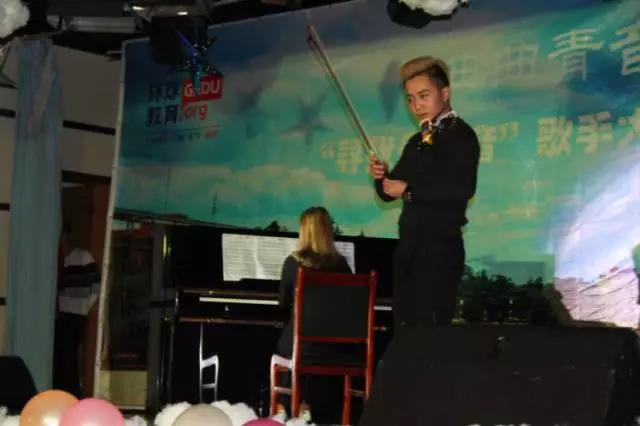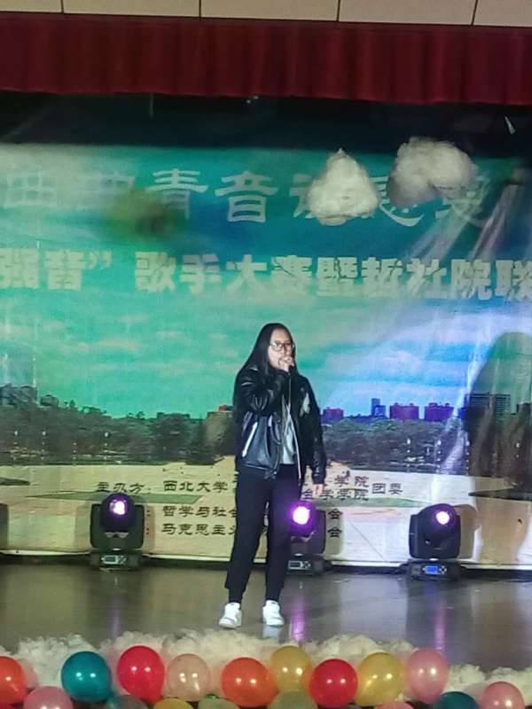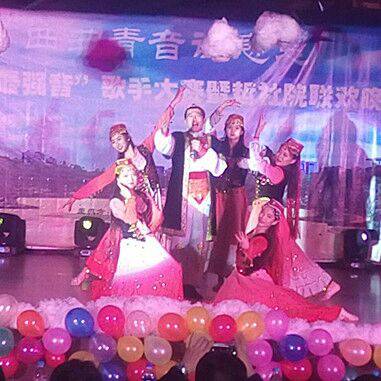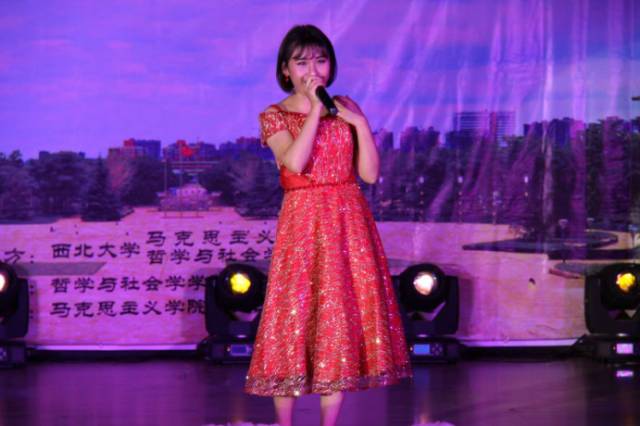 张煜同学作为第一个出场的比赛歌手,一身红裙,伴随着天竺少女的音乐舞动,嗓音清澈婉转,舞姿优雅多情,引得在场的观众们一阵阵的掌声。