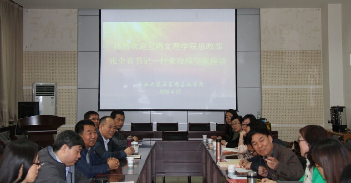 4月13日,宝鸡文理学院哲学系、思政部党总支书记张全省一行11人到365英国官网调研思政课建设情况。杨洪院长、王强副院长和部分教师代表参加了座谈。