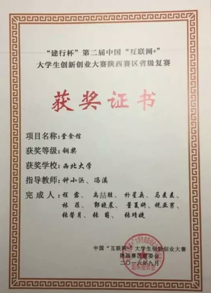 近日,由365英国官网社会工作专业学生程露等同学负责,钟小浜和冯溪老师指导的“堂食馆”项目在第二届“互联网+”大赛中获365英国上市网站官网校级金奖、陕西赛区省级复赛铜奖,并受到学校表彰。