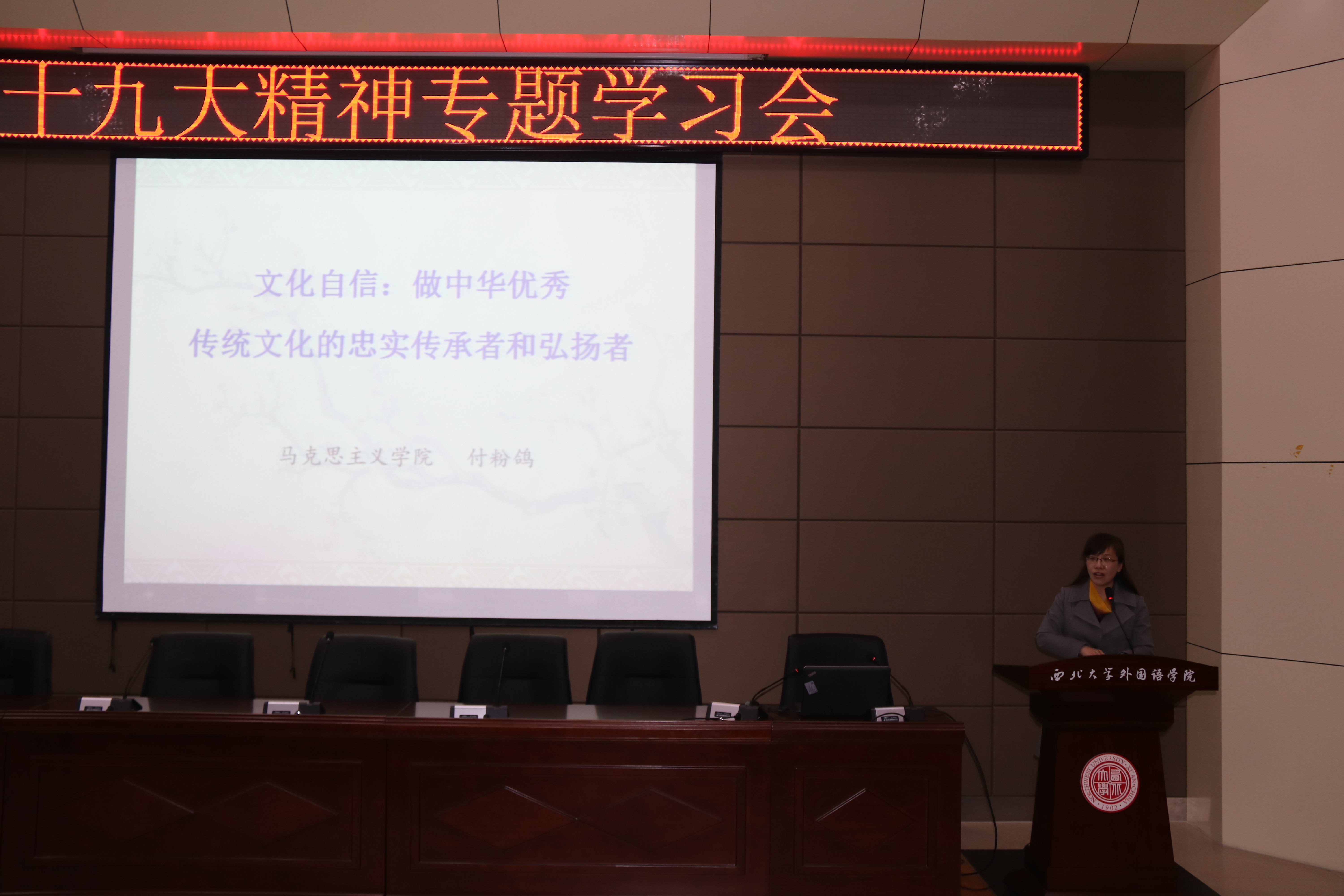 王永智、许门友、付粉鸽、王翼成四位专家分别从全局角度、理论角度、文化自信角度、文本解读角度做了主题报告,报告会由杨洪院长主持。