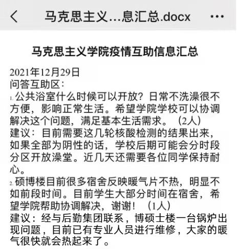 三是抓好学生干部队伍。学院充分发挥学生骨干作用,使学生干部在关键时期成为辅导员的得力助手,在学院学生信息填报提醒、信息统计、舆情监测等方面发挥积极作用。学院指导院研究生会组建学生疫情防控小组,确保每个年级、专业、宿舍都有学生干部联络人,确保信息渠道通畅,并建立了学工干部值班制度。