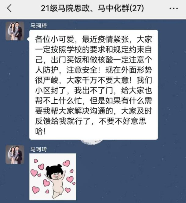 二是抓好导师队伍,导师全面参与学生疫情防控管理。院党委要求全体博、硕导切实负起责任,全面参与、积极配合学院做到学生管理“不漏一人”。学院将全体学生分为6组,由6名院领导带队和导师各负责一组,每个组的工作任务为:一是及时传达各级疫情防控工作要求;二是做好学生思想教育工作,引导学生以积极心态应对疫情,合理安排学习生活;三是结合教学科研要求,每周至少开展一次形式灵活的线上活动;四是了解学生实际困难和需求,及时协调、解决。做到及时关心慰问学生,及时掌握学生思想状况,让学生真切感受到来自学院和导师的关爱和温暖。
