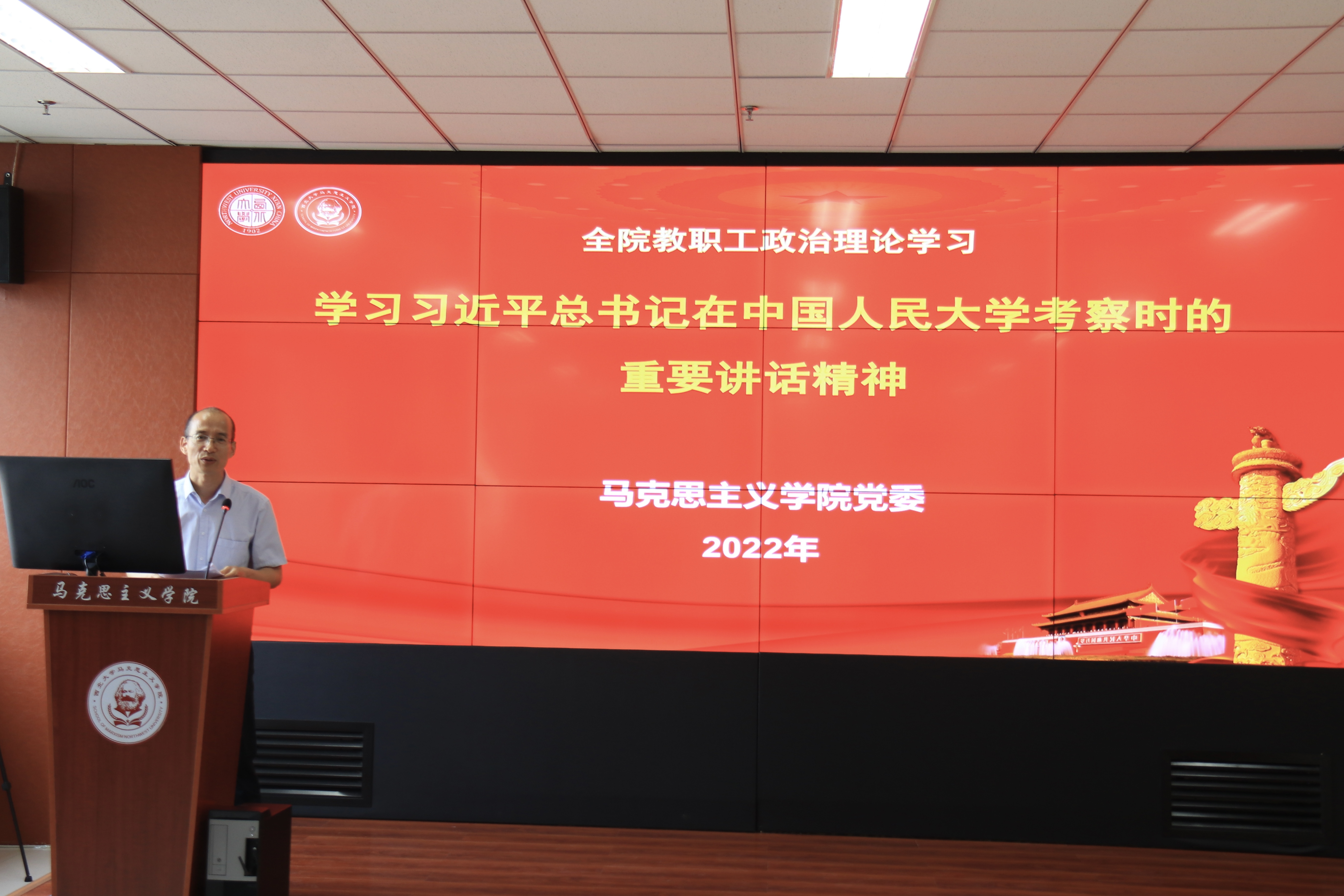 院党委书记韩凯峰带领全体教师深入学习了习近平总书记在中国人民大学考察时的重要讲话精神。他要求,学院各党支部、院团委要组织全院党员、团员和师生认真学习贯彻习近平总书记在中国人民大学考察时的重要讲话精神。他强调,要把学习贯彻此次重要讲话精神与习近平总书记在全国高校思想政治工作会议上的重要讲话精神、在学校思想政治理论课教师座谈会的重要讲话精神相结合,深入学习领会贯彻习近平总书记对思政课建设、思政课教师队伍建设等提出的要求和期望。要把学习贯彻此次重要讲话精神与加强新时代365英国上市网站官网建设相结合,按照党中央要求,着力建好建强365英国上市网站官网主阵地,坚持“马院姓马,在马言马”的鲜明导向和办学原则;进一步凝练学科方向、突出学科特色、发挥学科优势,不断推进学科高质量发展;着力创新思政课教学方式方法,切实提高思政课教学质量,切实把立德树人、铸魂育人落到实处。要把学习贯彻此次重要讲话精神与加强教师思想政治教育和师德师风建设相结合,全院教师要努力做到政治强、情怀深、思维新、视野广、自律严、人格正,切实用高尚的人格感染学生,用真理的力量感召学生,以深厚的理论功底赢得学生,自觉做为学为人的表率,做让学生喜爱的人;努力做“经师”和“人师”的统一者,立志做学生为学、为事、为人的大先生。