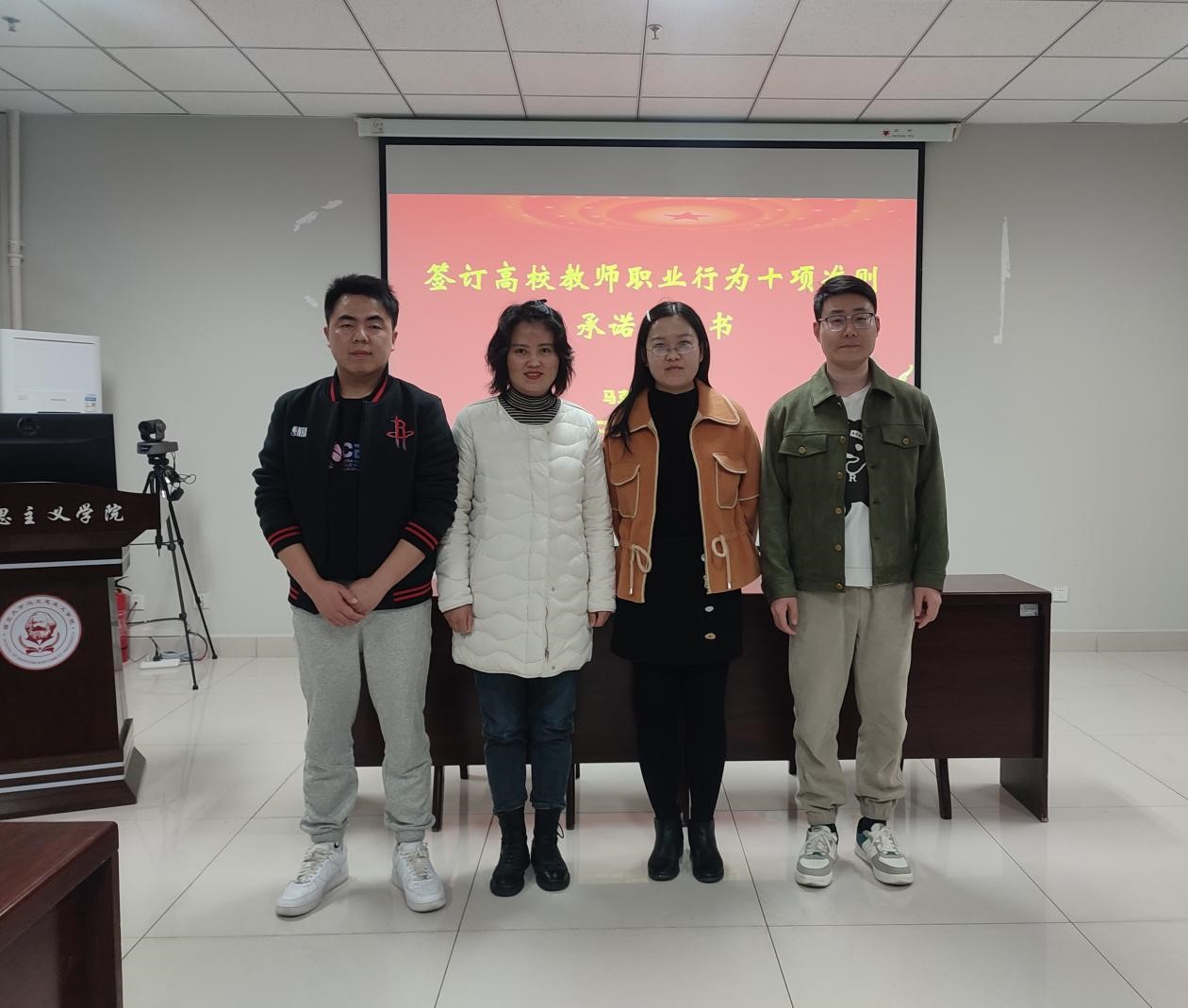 学院与四位新进教师签定了学院教师遵守新时代高校教师职业行为十项准则承诺践诺书。会议强调,要持续加强师德师风建设,不断营造立德树人良好氛围。