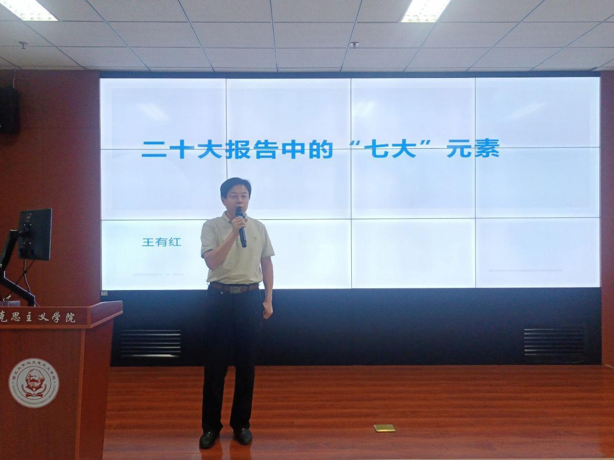 随后,王有红副教授为参会同学讲了一堂题为《二十大报告中的“七大”元素》的示范微党课,通过大会主题、马克思主义中国化史上的关键节点、党的宗旨与群众路线等关键词对二十大报告的若干元素进行了深入剖析,并指出全党要弘扬延安精神,滋养初心、淬炼灵魂,勇于推进党的自我革命。