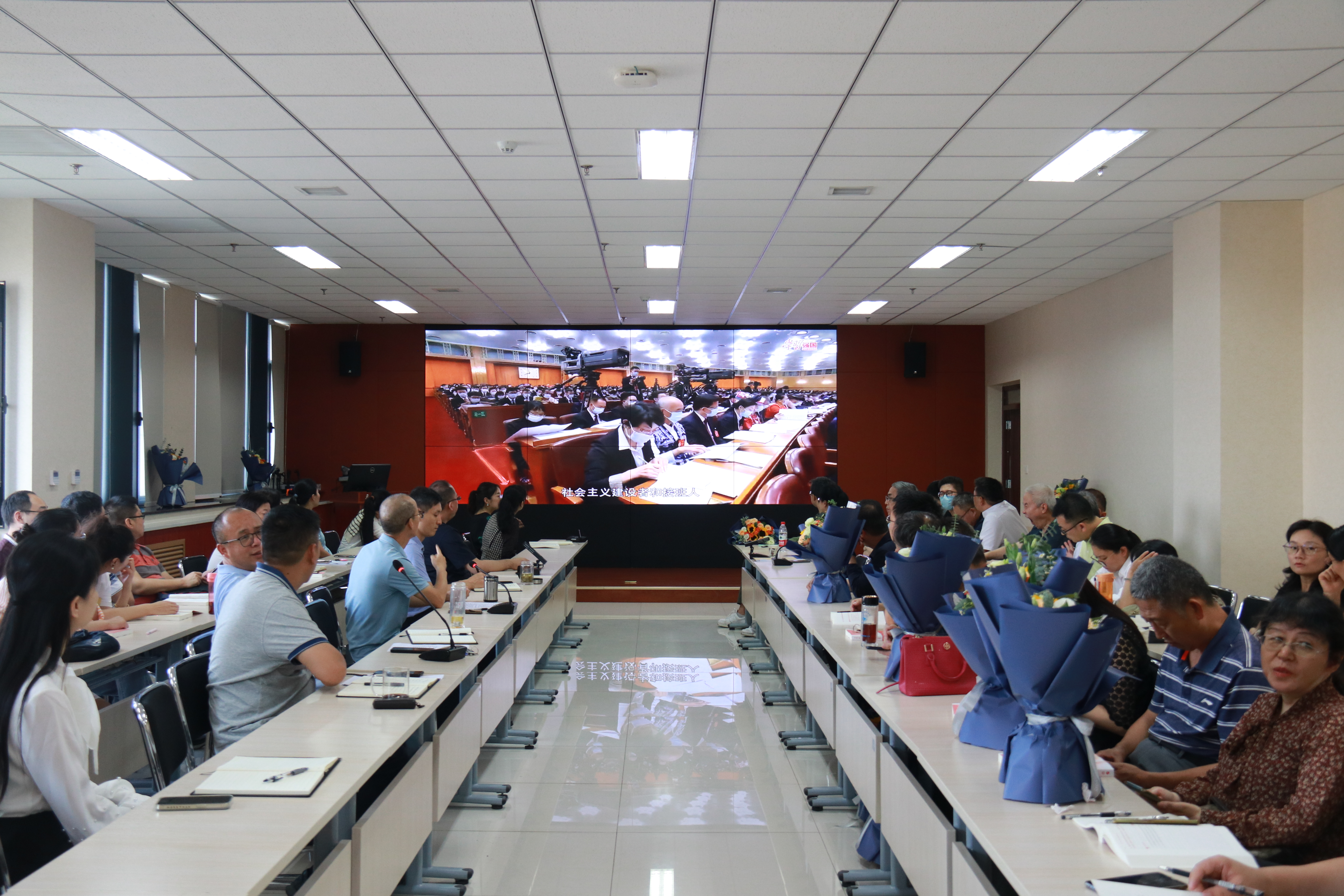 会上,学院全体教师集体观看了纪录片《习近平的教师情》。
