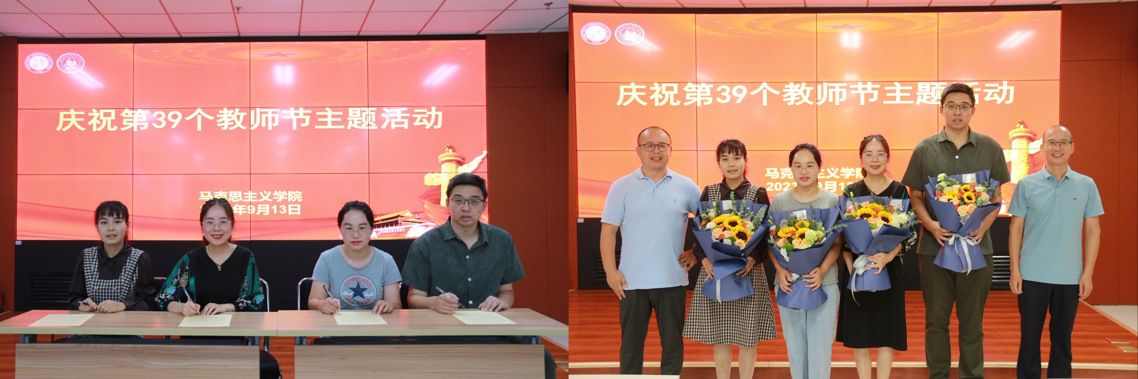 接着,四位新入职教师签订学院教师遵守新时代高校教师职业行为十项准则承诺践诺书,并由韩凯峰与何博敬送鲜花。
