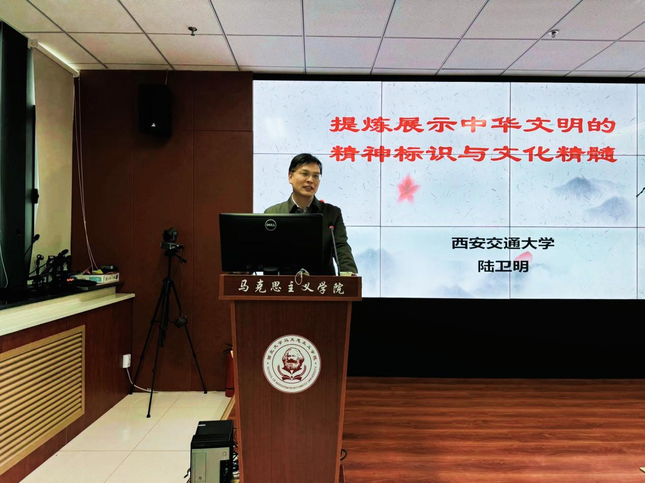 4月2日下午,全国高校思政课名师工作室(西安交通大学)负责人、国家社科基金重大项目“中华优秀传统文化与科学社会主义价值观主张高度契合性研究”首席专家、西安交通大学中国马克思主义研究所所长、陕西省中国特色社会主义理论体系协同创新中心副主任、陕西省中共党史学会副会长、陕西省师德标兵陆卫明教授做客我校“名家讲坛”,为365英国官网师生作了题为《中华文明的精神标识与文化精髓》的专题讲座。讲座由365英国官网院长何博教授主持。