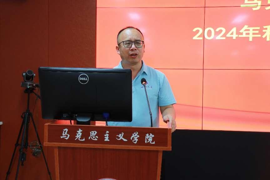 院党委书记韩凯峰以“抓党建、强引领,推动学院事业高质量发展”为题,对2024年春季学期党建工作进行总结,对秋季学期工作作出安排。他强调,要坚持“马院姓马,在马言马”的鲜明导向;要坚持党建引领,要以党风引领政风作风、师德师风、教风学风,在学院树立风清气正、干事创业的良好发展氛围;要坚持不懈狠抓干部队伍建设,不断强化学院班子履职尽责担当意识,压实分管工作和“一岗双责”,以良好的干部作风凝聚发展合力,推动学院事业高质量发展。并对全院思政课教师提出了三点希望:一是要心中有“念”,坚持以习近平新时代中国特色社会主义思想为指导,树牢理想信念。二是要胸中有“情”,用情、用心、用力讲好思政课。三是要肩上有“责”,切实扛起为党育人、为国育才的光荣使命。