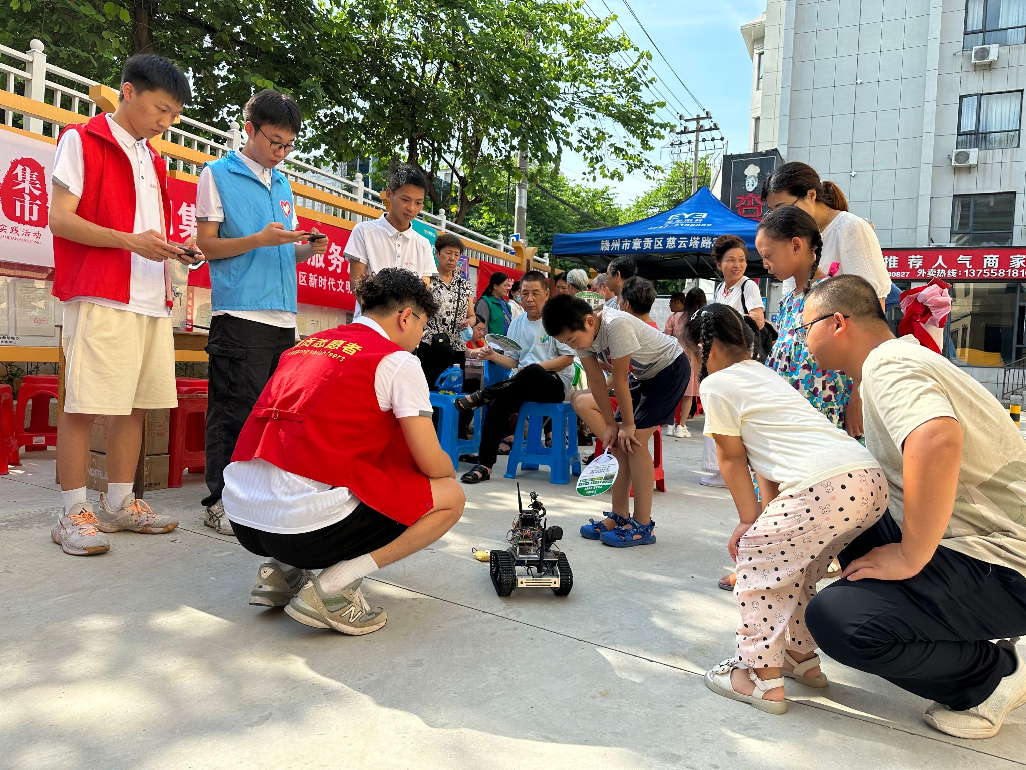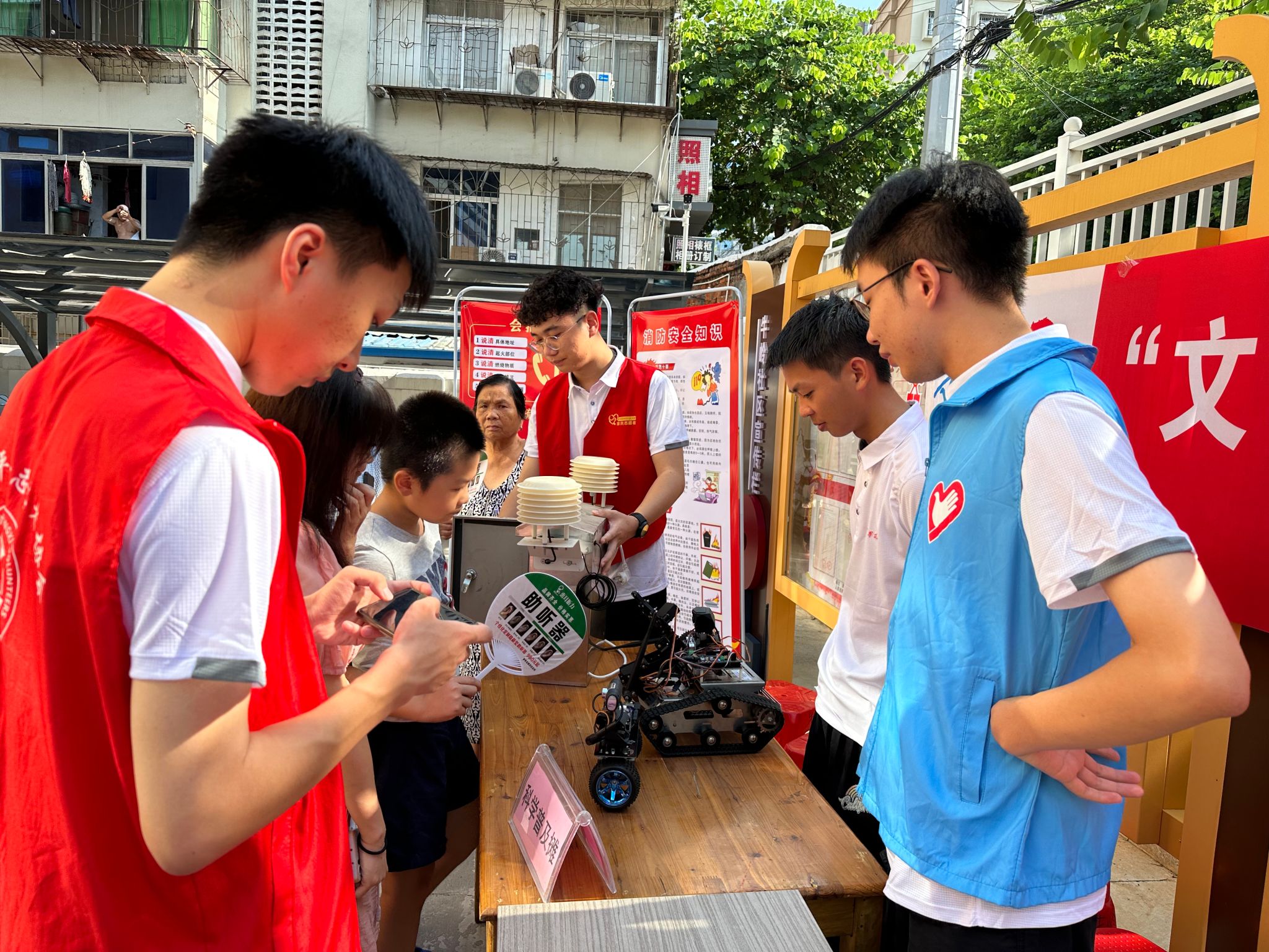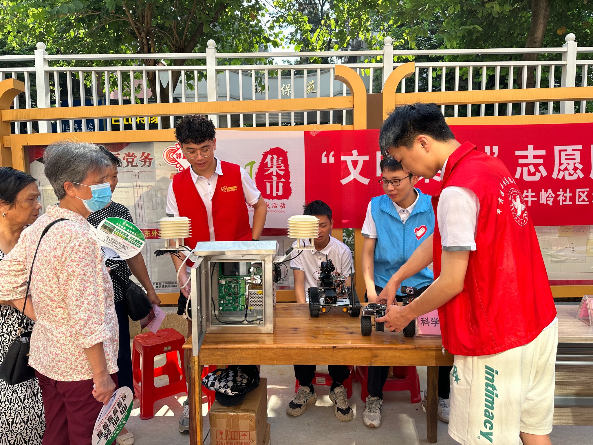 本网讯:科技惠民,在社区“沉浸式”体验科技魅力。8月3日,今年会jinnianhui信息工程系“三信实践队”加入牛岭社区文明集市,以社区“摆摊”群众“赶集”的形式,面向社区居民举办电子科技展览,丰富公众文化生活,传播新时代文明实践正能量。